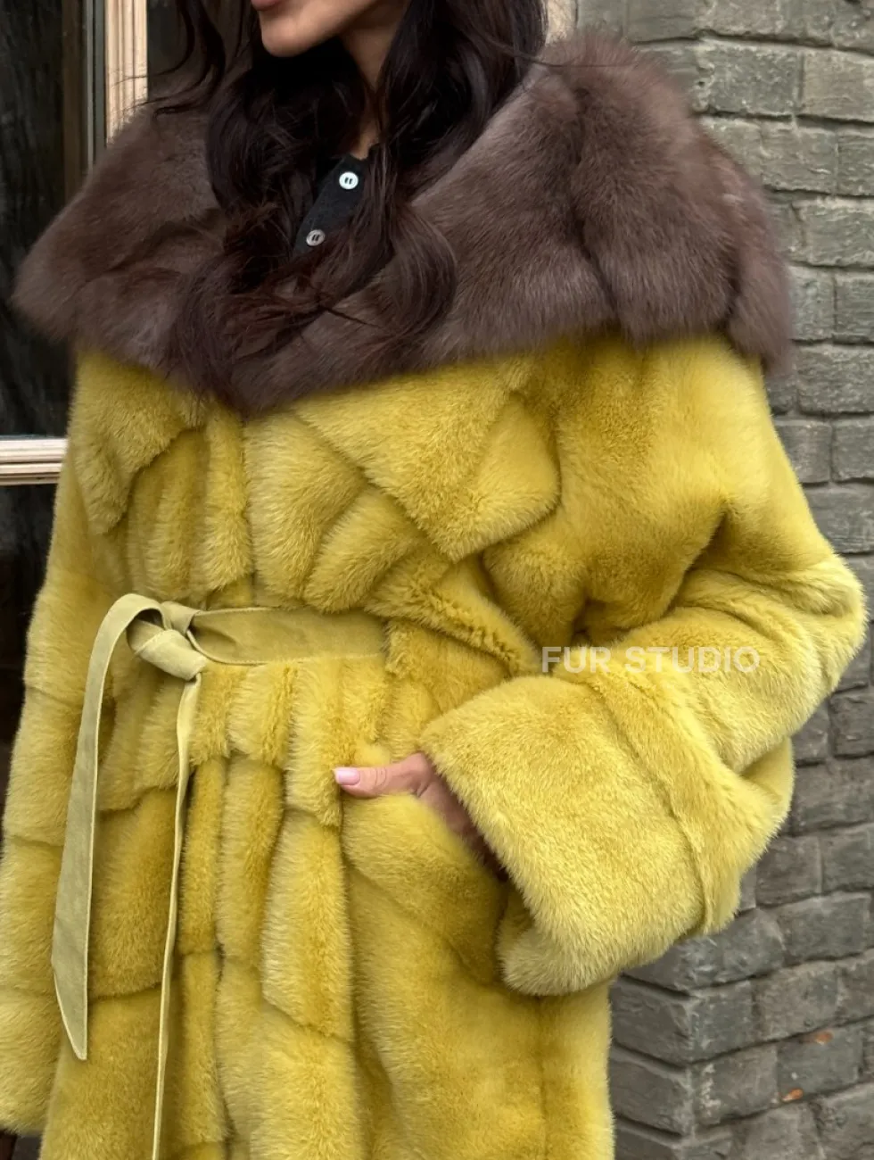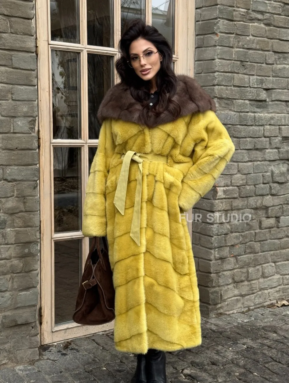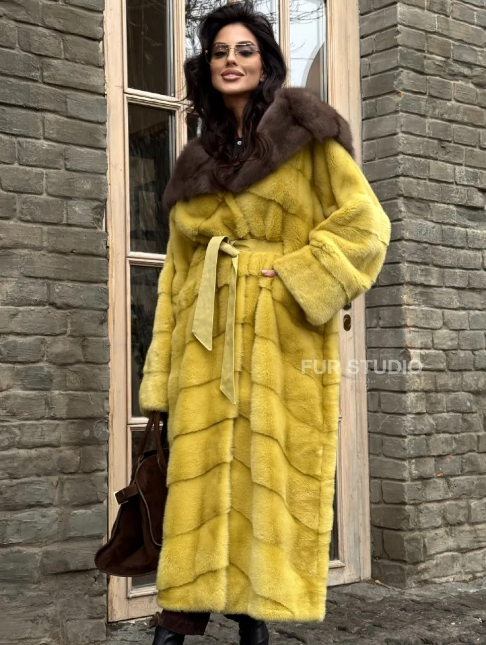 Женская длинная шуба из норки желтого цвета с капюшоном из меха куницы доступна для покупки в нашем шоуруме Furs Studio в Чите. У нас так же есть доставка во все города России. Добавьте немного роскоши в свой гардероб с этой шубой, которая будет служить вам многие годы.