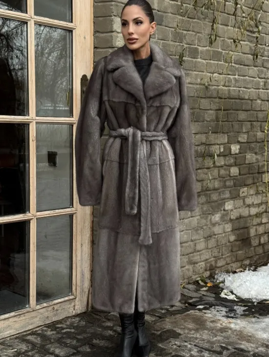 Мех данной шубы аукционная норка, цвет желтый. Предлагается в размерах от 42 до 50. Длина модели 125-130 см, что выгодно подчеркивает фигуру девушек. Эта модель идеально подойдет для девушек и женщин, предпочитающих роскошные натуральные меха.