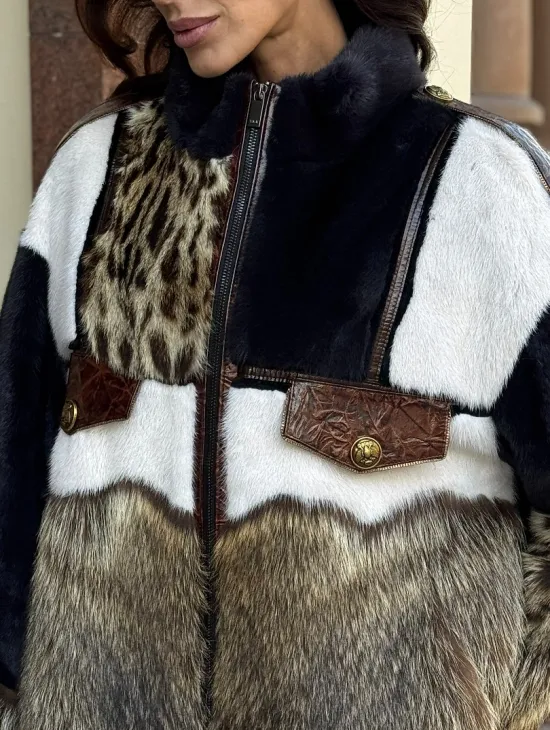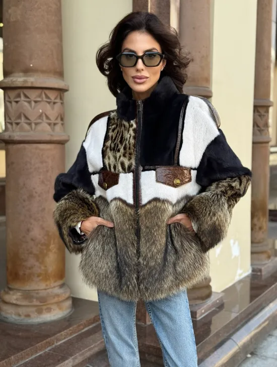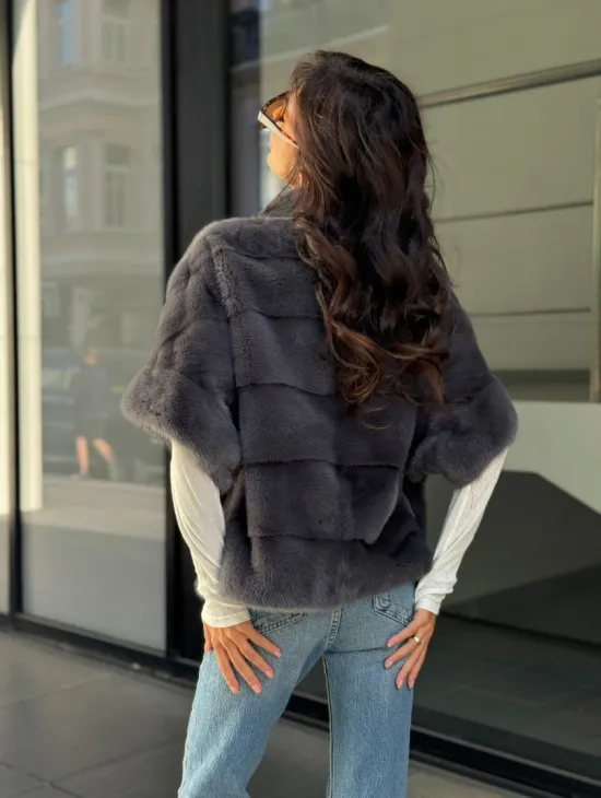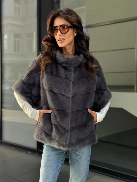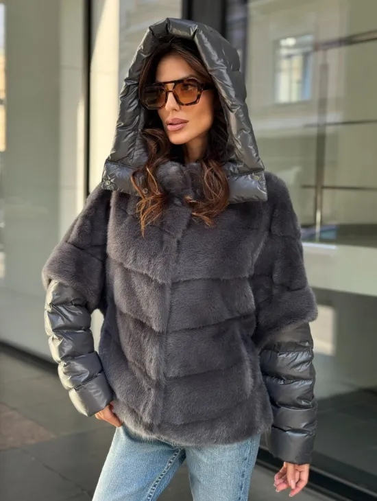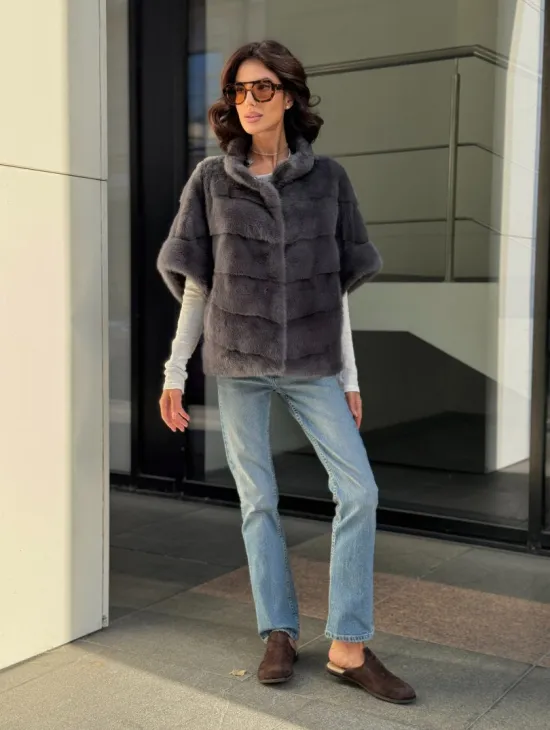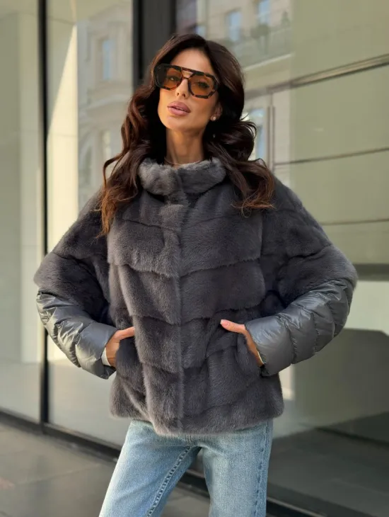 Материал выбранной модели — аукционная норка, доступна в цвете серый. Куртка предлагается в разнообразии размеров, от S до XL, а ее длина составляет 55-60 см, что выигрышно подчеркивает вашу фигуру. Этот вариант идеально подходит для тех, кто ценит роскошь и утонченность натуральных материалов.