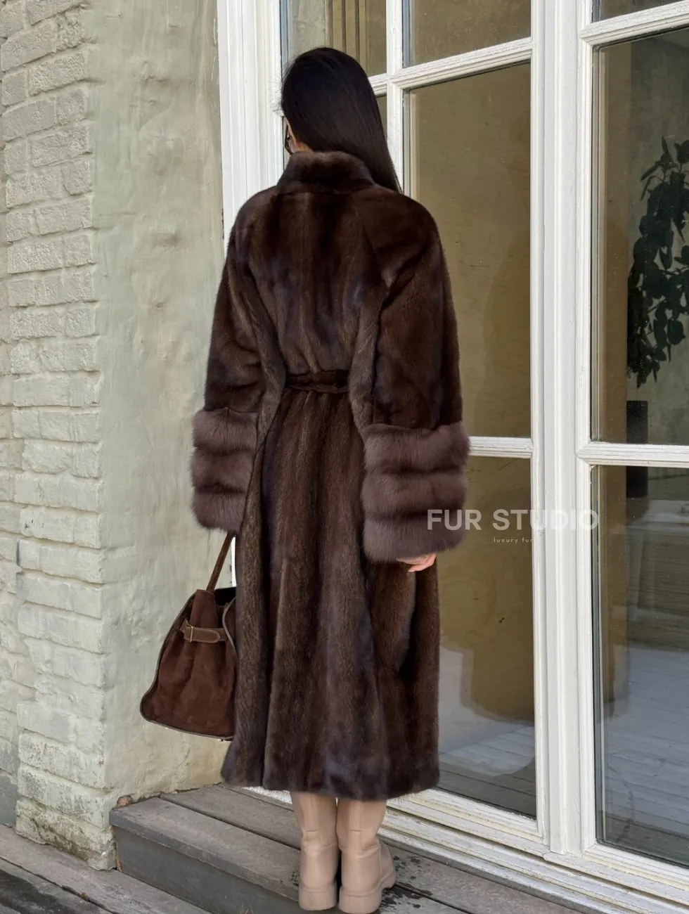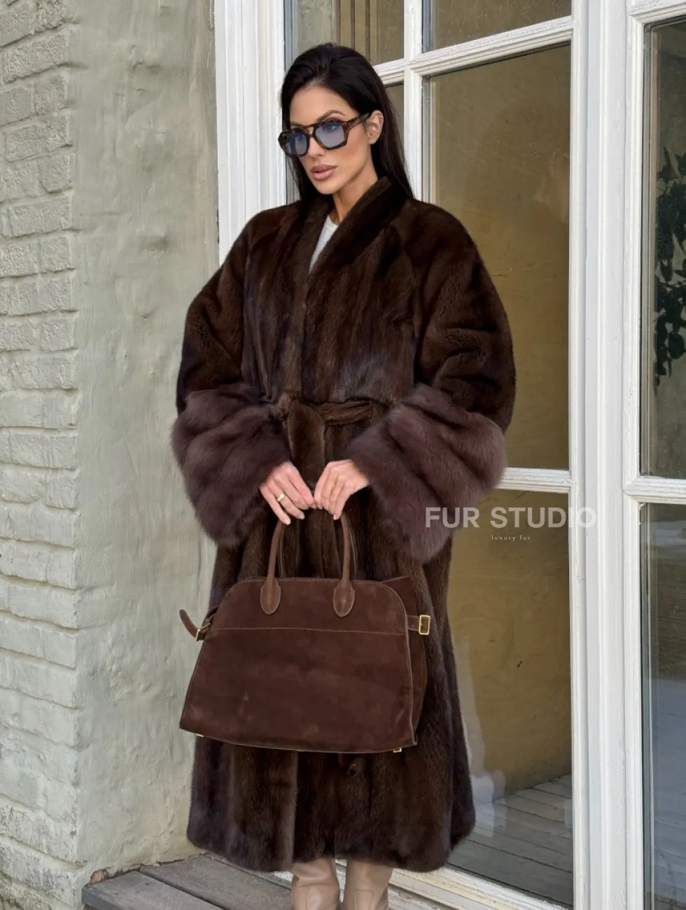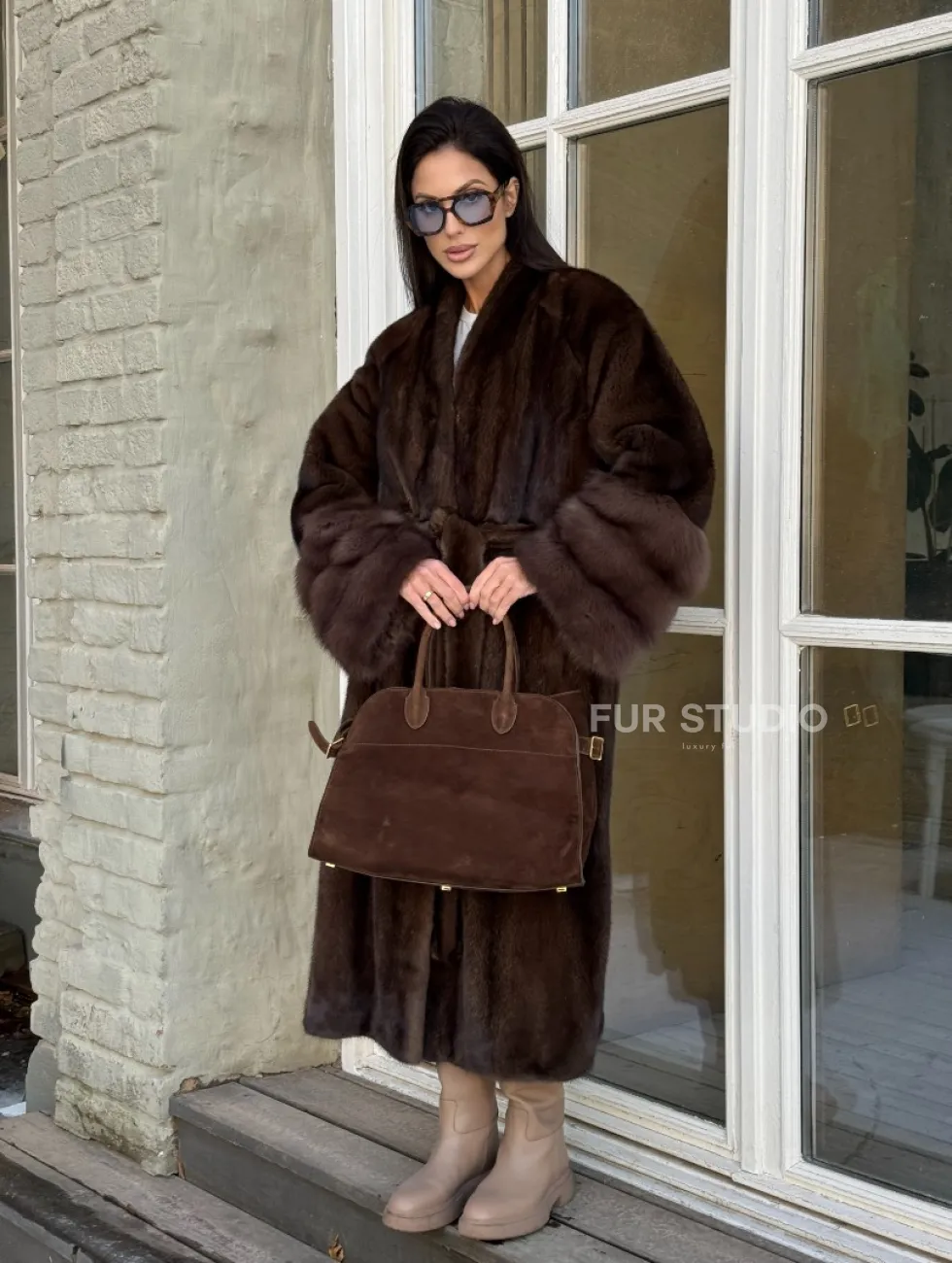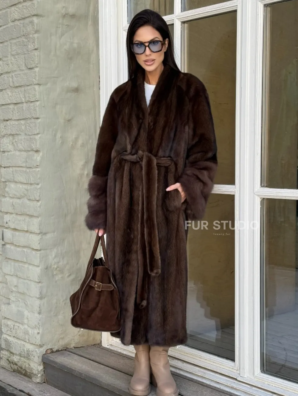 Мех данной шубы скандинавская норка, цвет коричневый. Предлагается в размерах от 42 до 48. Длина модели 115-120 см, что выгодно подчеркивает фигуру девушек. Эта модель идеально подойдет для девушек и женщин, предпочитающих роскошные натуральные меха.