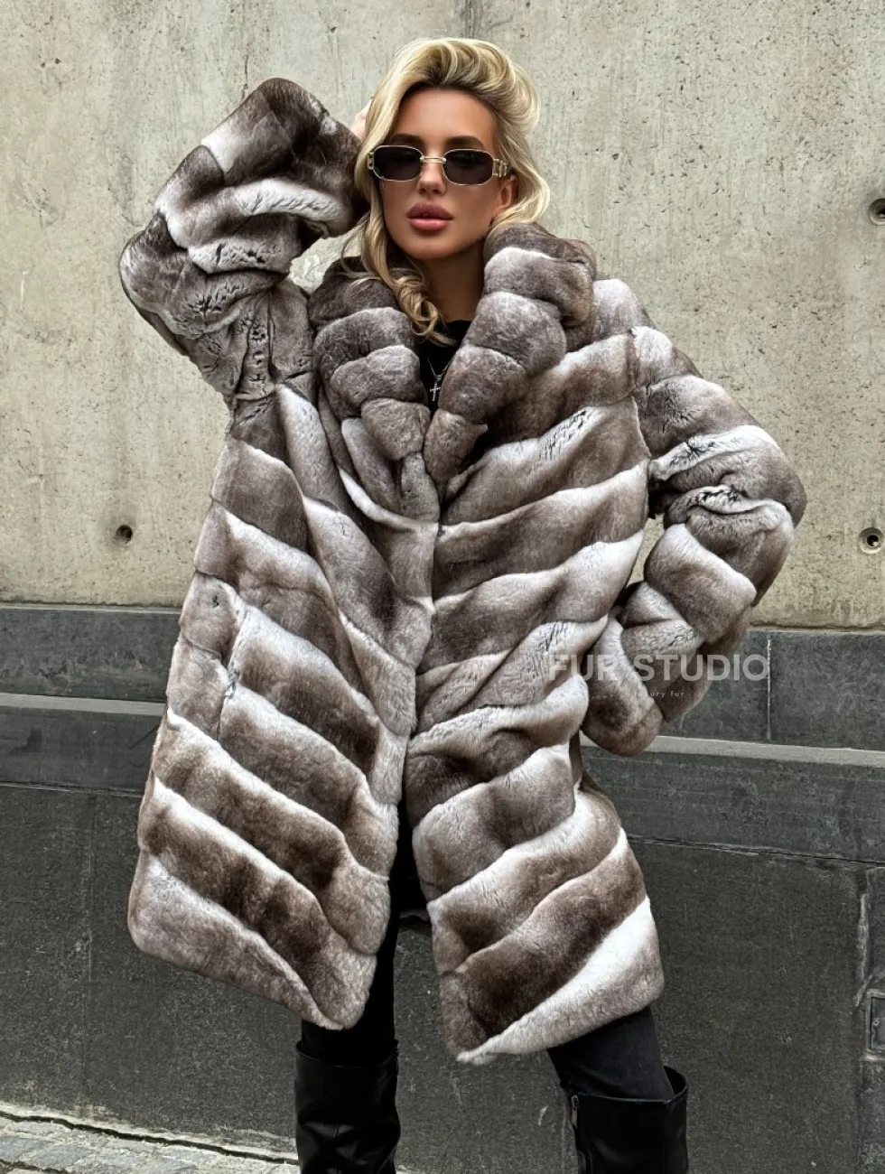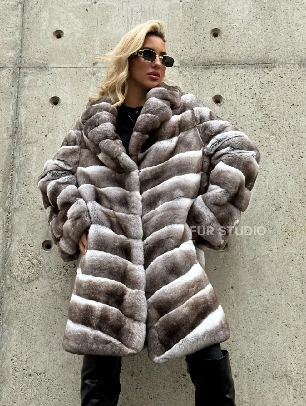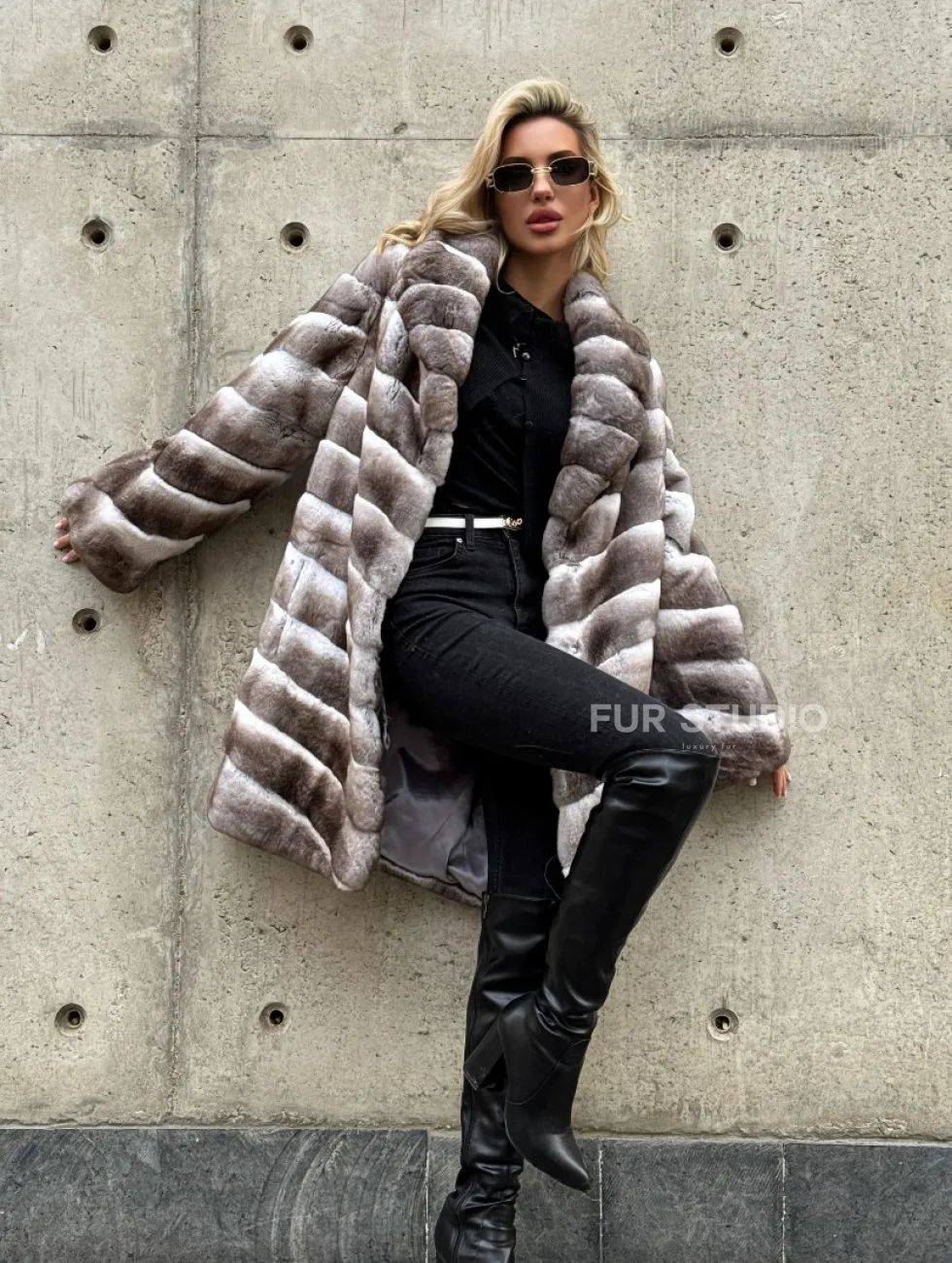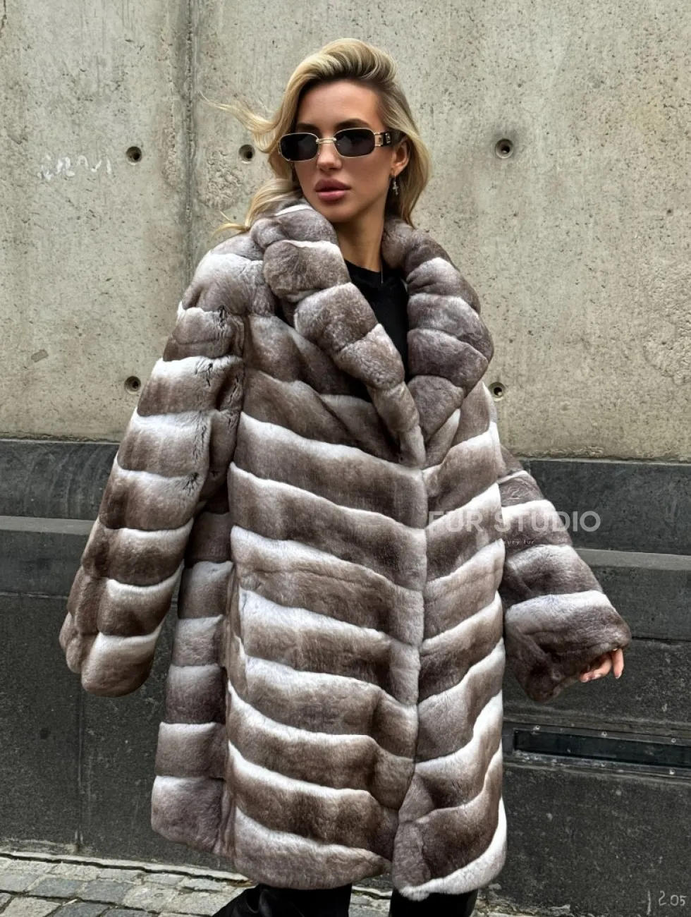Женская серая шуба из элитного шиншиллового кролика (рекса) с английским воротником доступна для покупки в нашем шоуруме Furs Studio в Чите. У нас так же есть доставка во все города России. Добавьте немного роскоши в свой гардероб с этой шубой, которая будет служить вам многие годы.