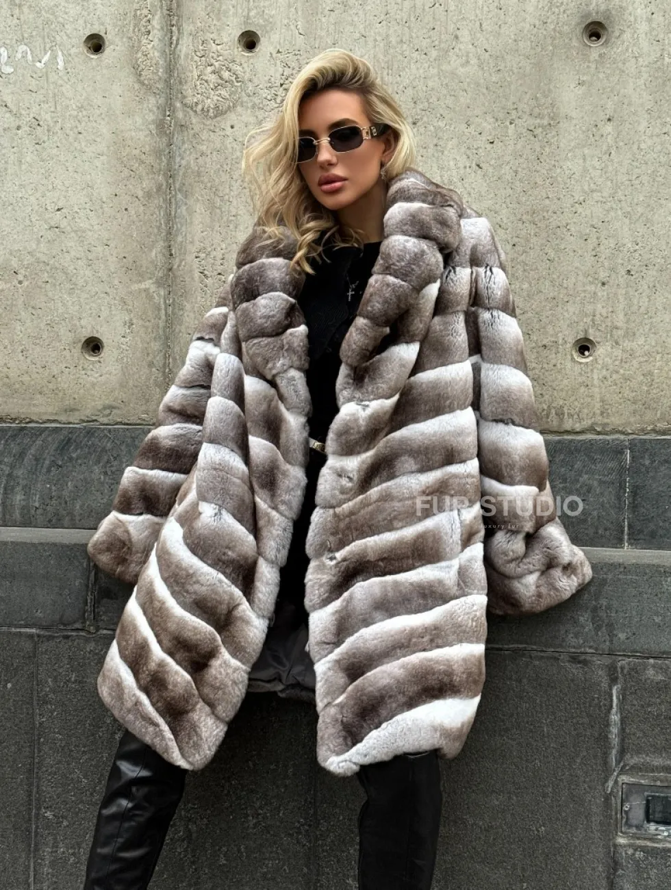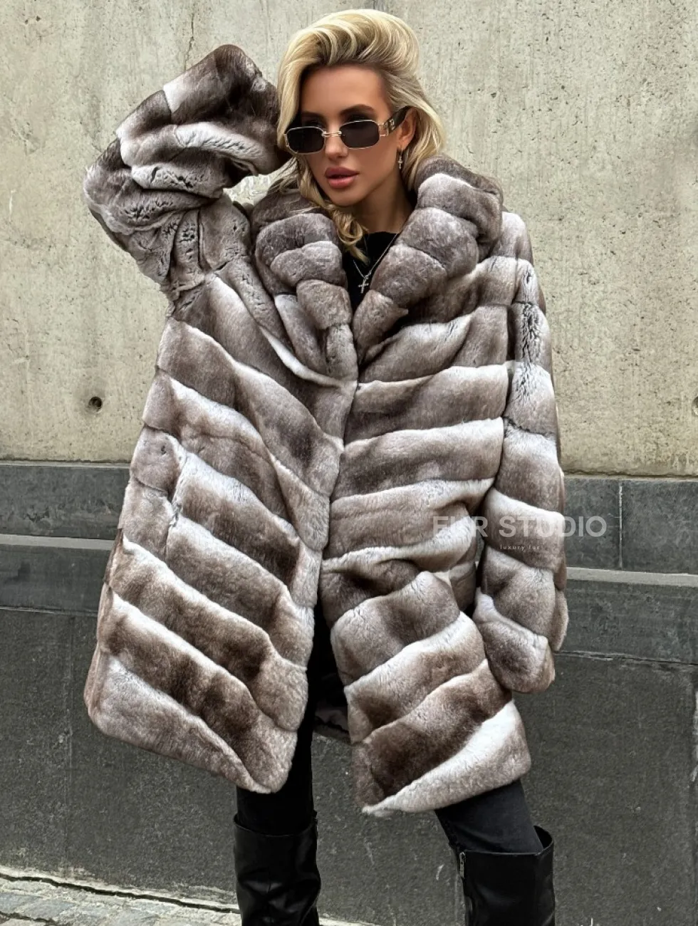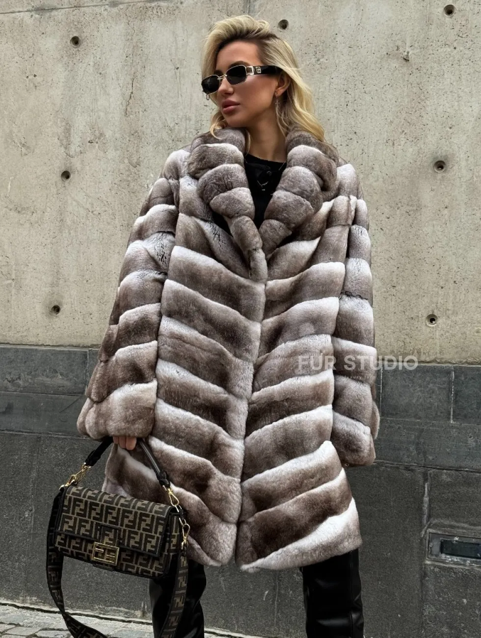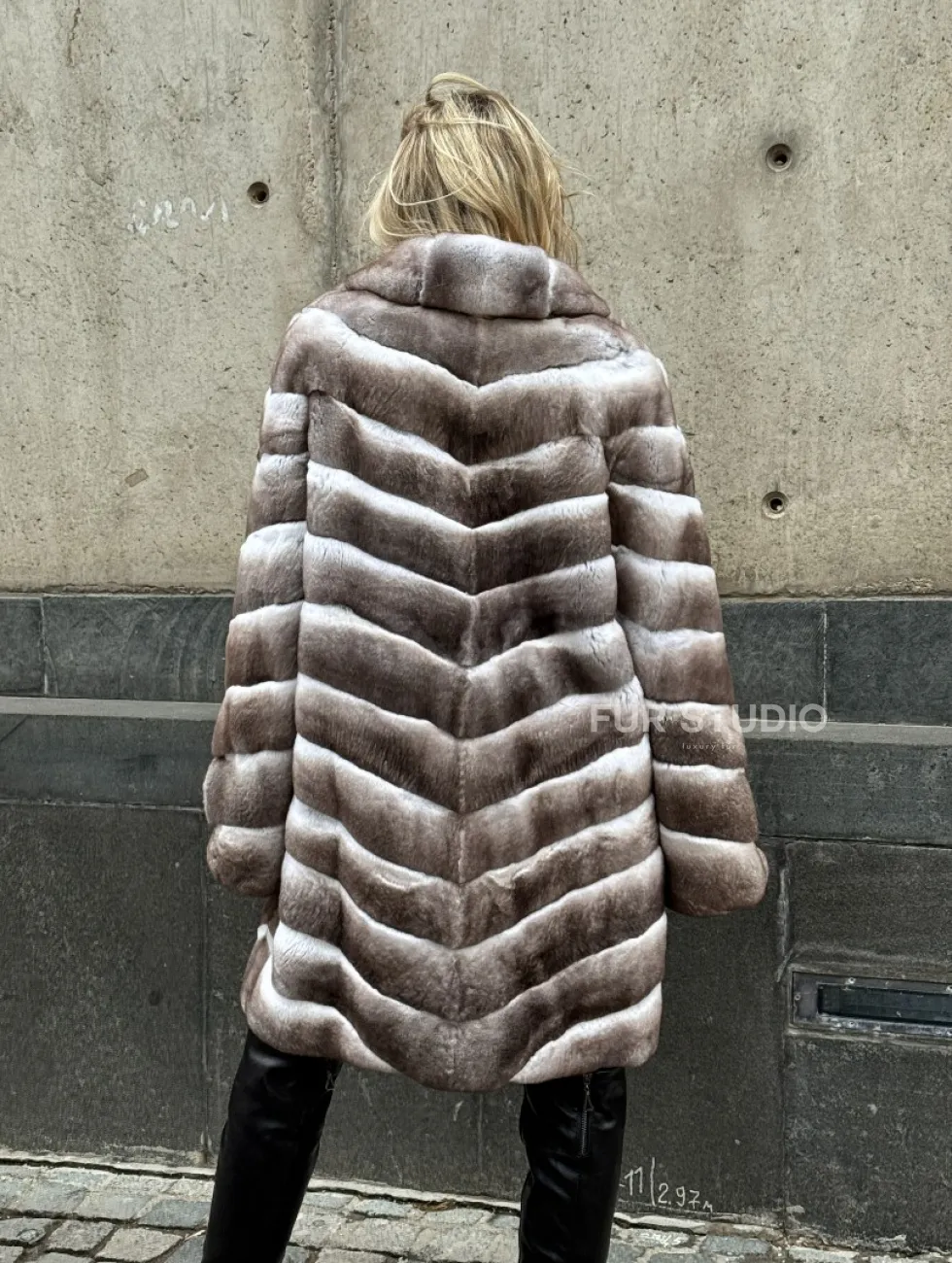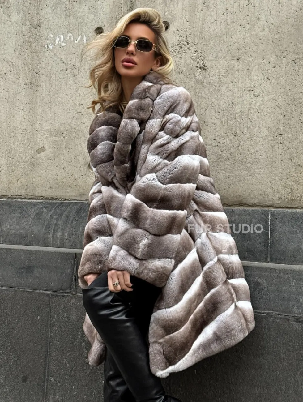 Женская серая шуба из элитного шиншиллового кролика (рекса) с английским воротником доступна для покупки в нашем шоуруме Furs Studio в Чите. У нас так же есть доставка во все города России. Добавьте немного роскоши в свой гардероб с этой шубой, которая будет служить вам многие годы.