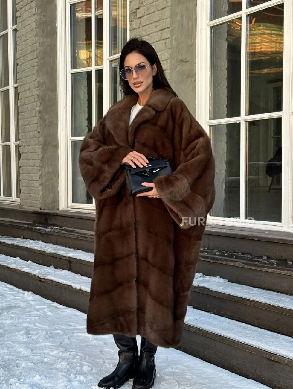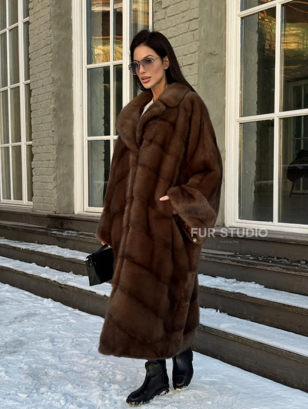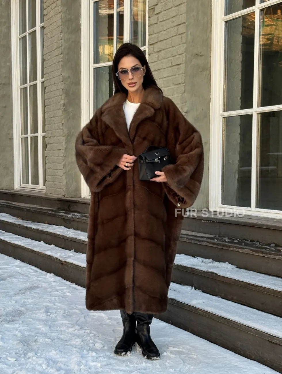 Мех данной шубы аукционная норка, цвет коричневый. Предлагается в размерах от 42 до 66. Длина модели 115-120 см, что выгодно подчеркивает фигуру девушек. Эта модель идеально подойдет для девушек и женщин, предпочитающих роскошные натуральные меха.