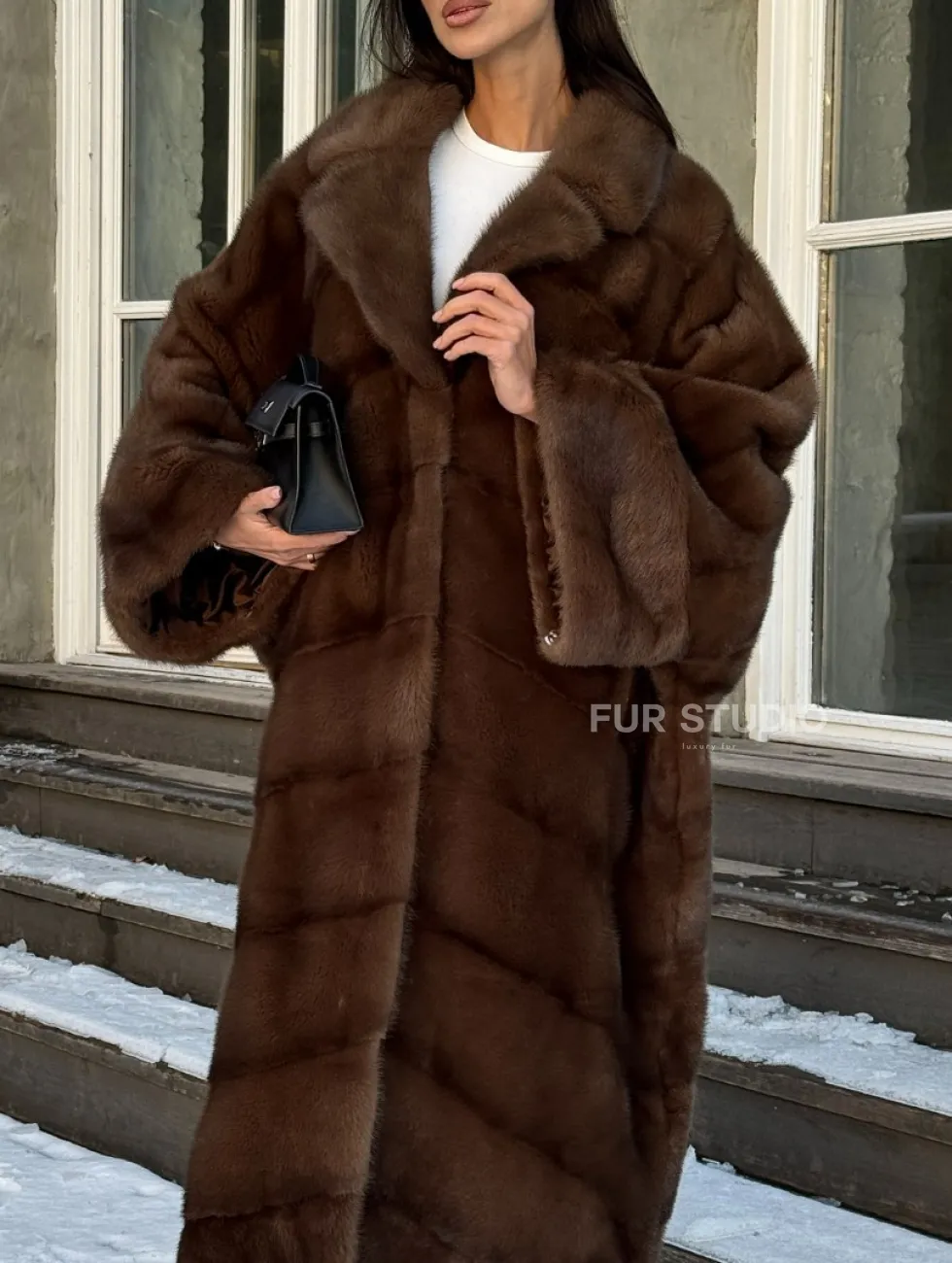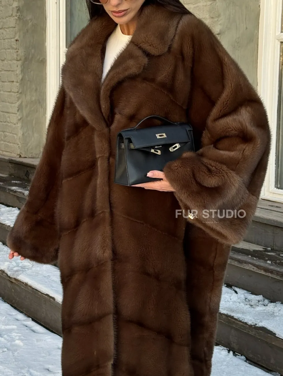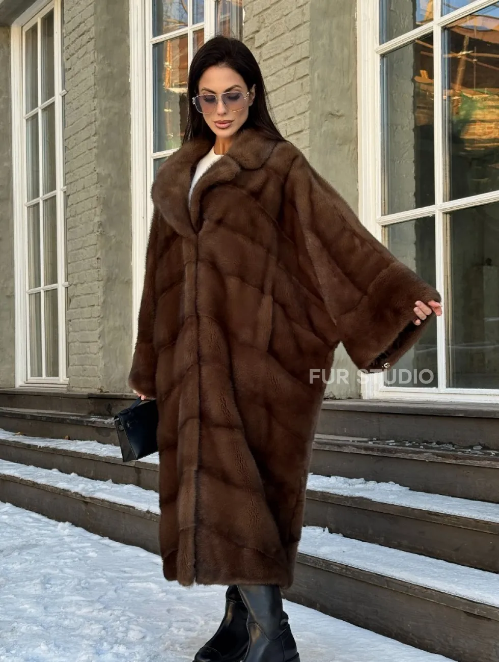 Мех данной шубы аукционная норка, цвет коричневый. Предлагается в размерах от 42 до 66. Длина модели 115-120 см, что выгодно подчеркивает фигуру девушек. Эта модель идеально подойдет для девушек и женщин, предпочитающих роскошные натуральные меха.