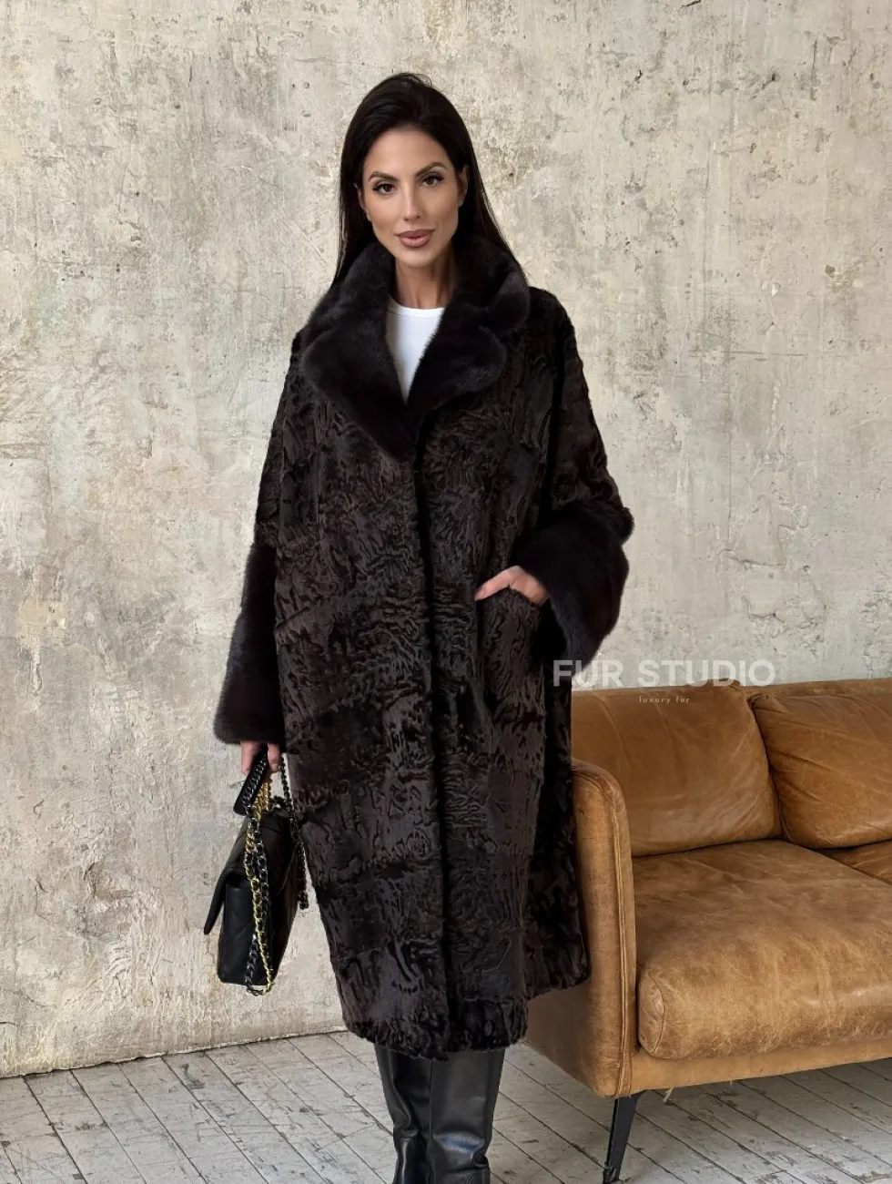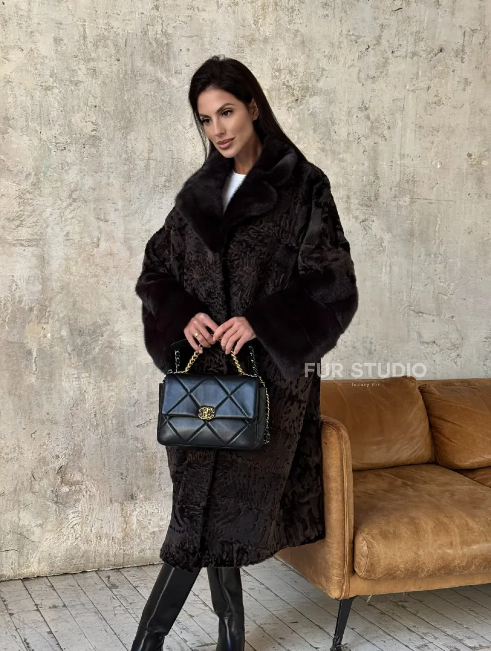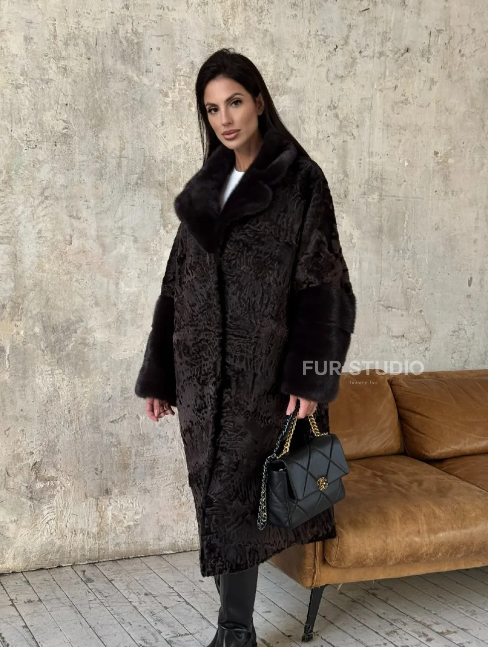 Женская шуба из натурального меха каракульчи с отделкой из норки доступна для покупки в нашем шоуруме Furs Studio в Чите. У нас так же есть доставка во все города России. Добавьте немного роскоши в свой гардероб с этой шубой, которая будет служить вам многие годы.