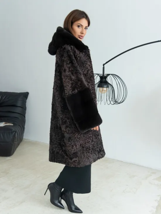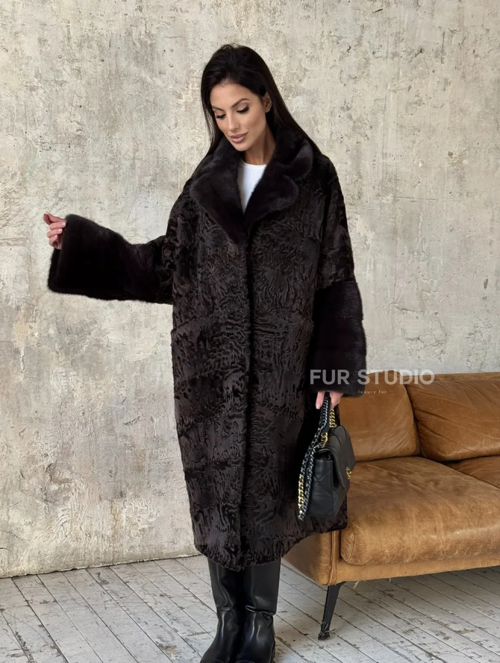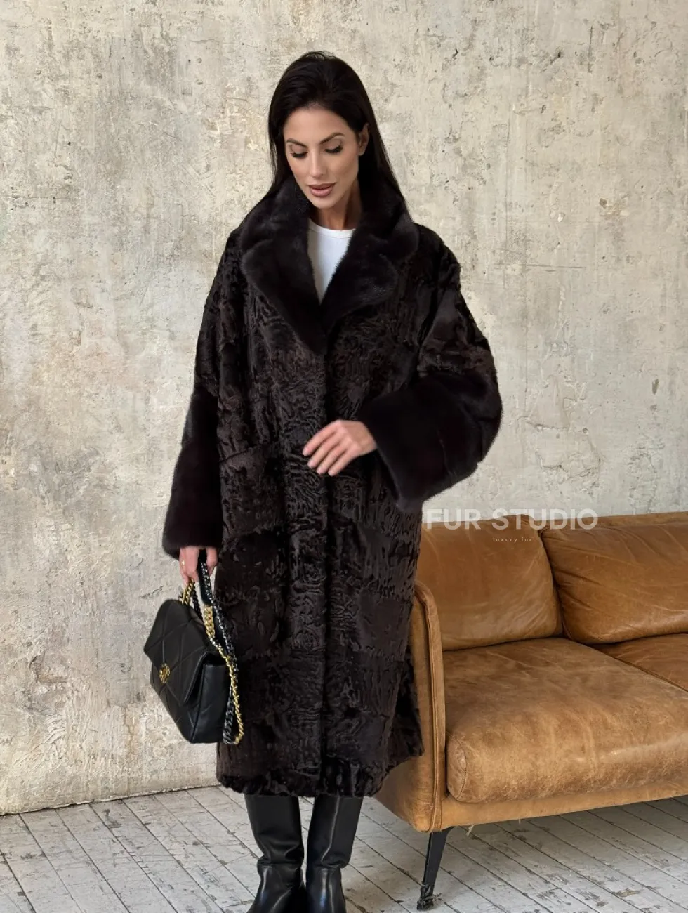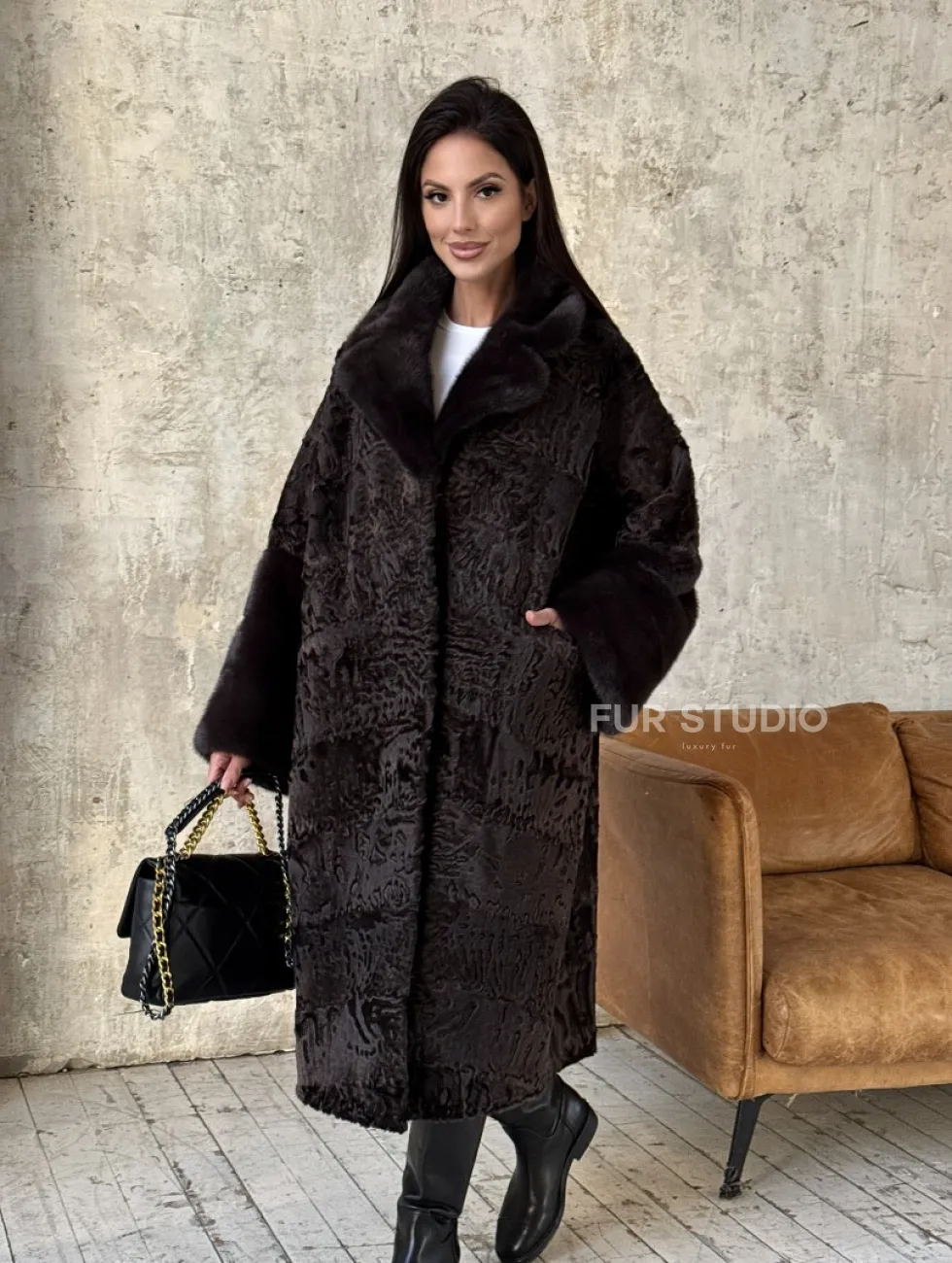 Женская шуба из натурального меха каракульчи с отделкой из норки доступна для покупки в нашем шоуруме Furs Studio в Чите. У нас так же есть доставка во все города России. Добавьте немного роскоши в свой гардероб с этой шубой, которая будет служить вам многие годы.