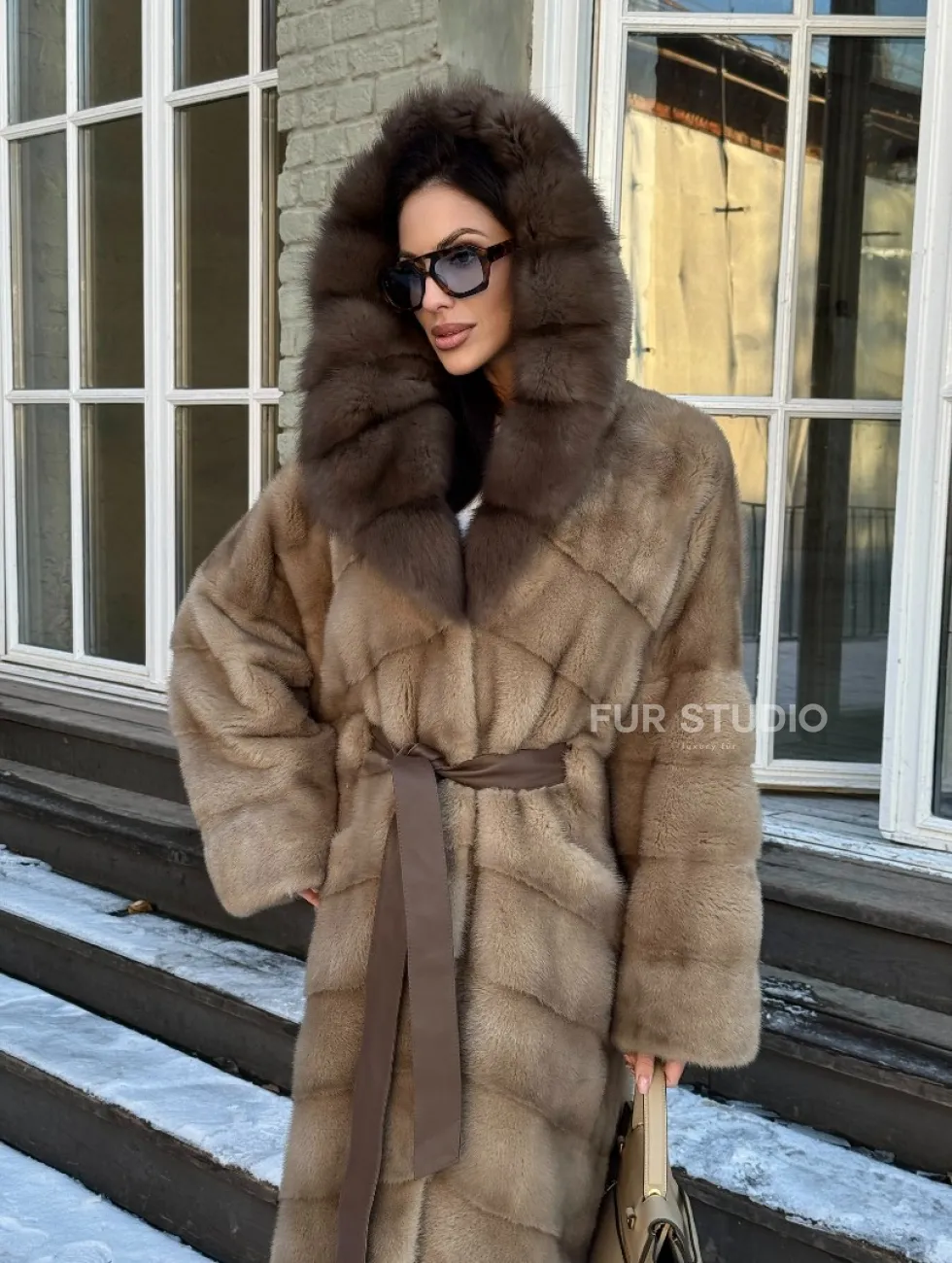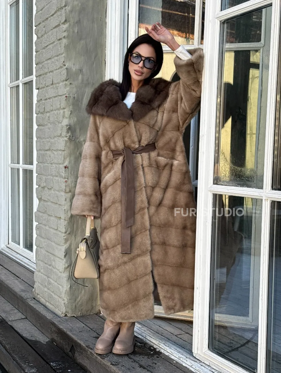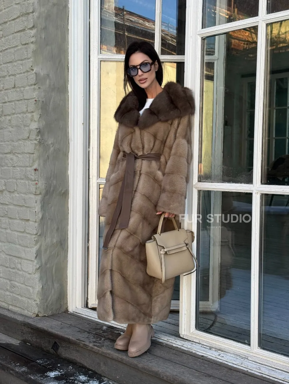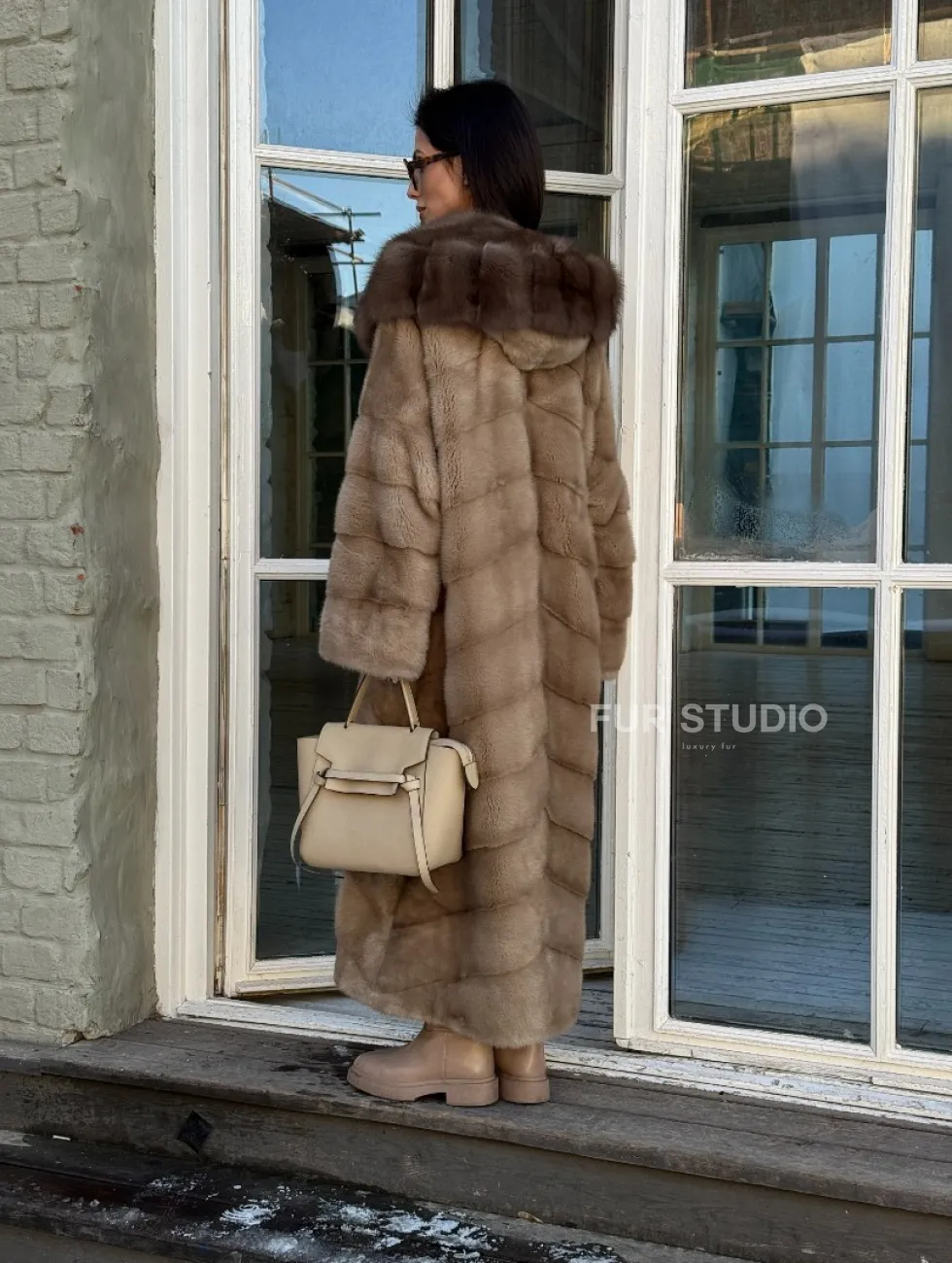 Женская удлиненная норковая шуба в цвете пастель с капюшоном из меха куницы доступна для покупки в нашем шоуруме Furs Studio в Чите. У нас так же есть доставка во все города России. Добавьте немного роскоши в свой гардероб с этой шубой, которая будет служить вам многие годы.