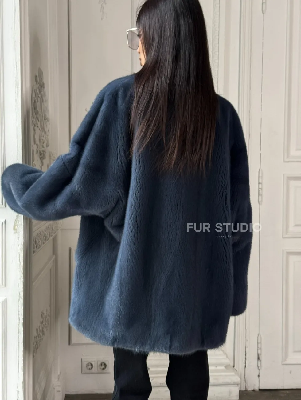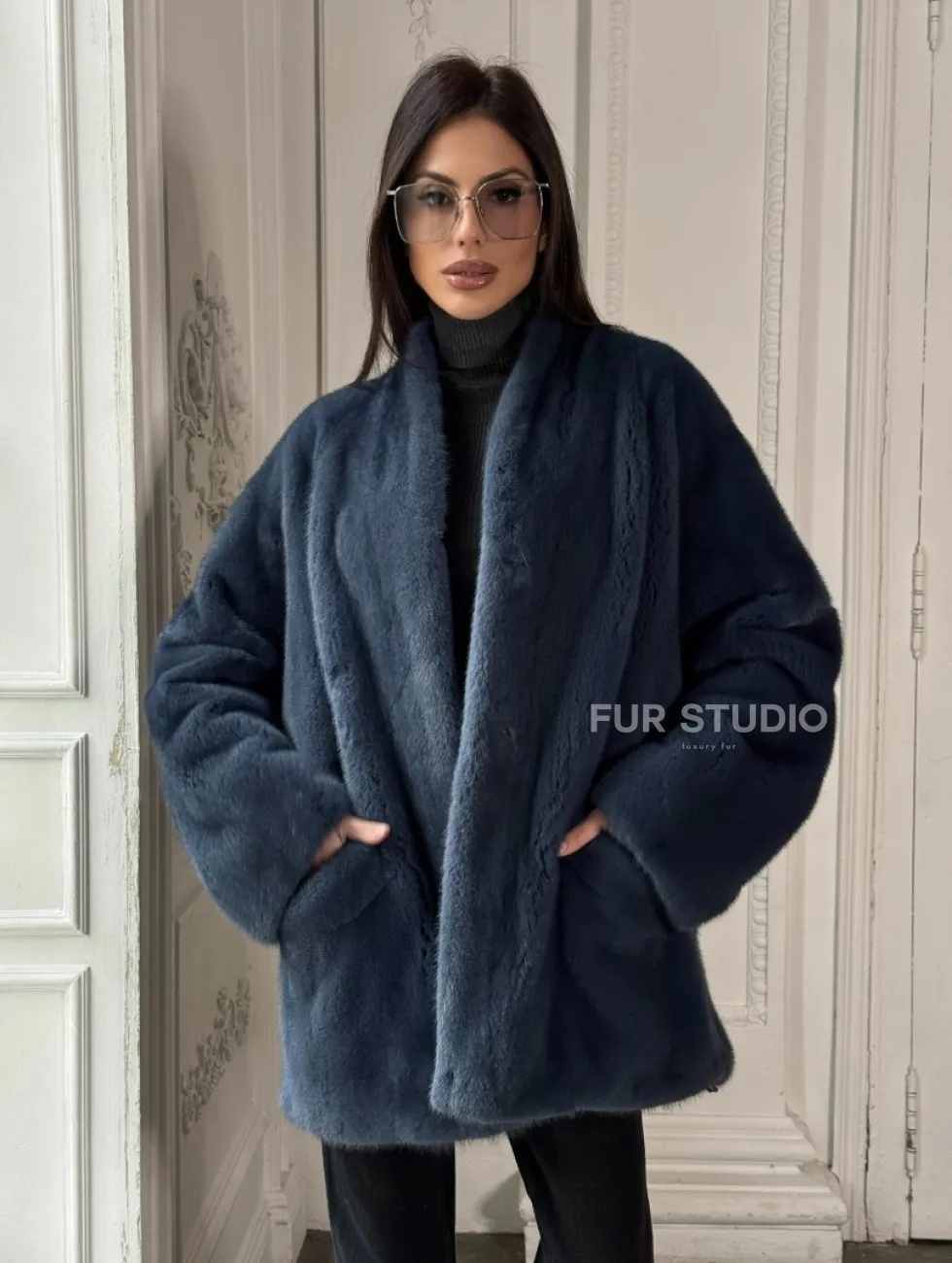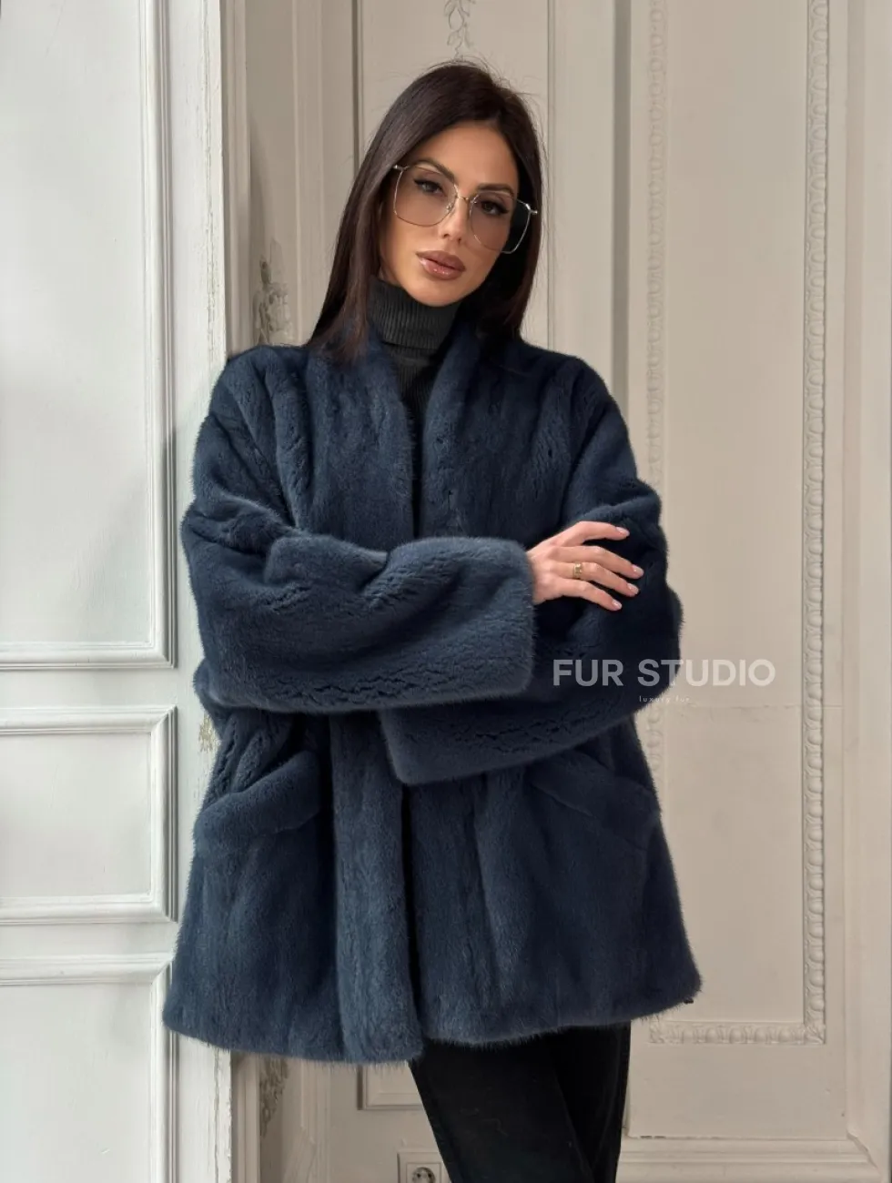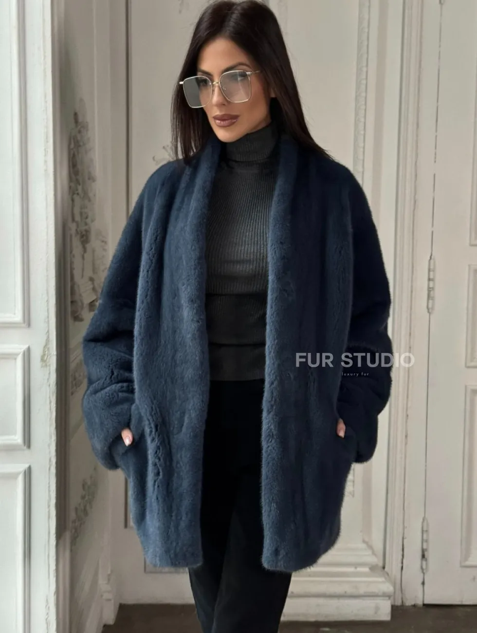 Мех данной шубы скандинавская норка, цвет синий. Предлагается в размерах от 42 до 52. Длина модели 70-75 см, что выгодно подчеркивает фигуру девушек. Эта модель идеально подойдет для девушек и женщин, предпочитающих роскошные натуральные меха.