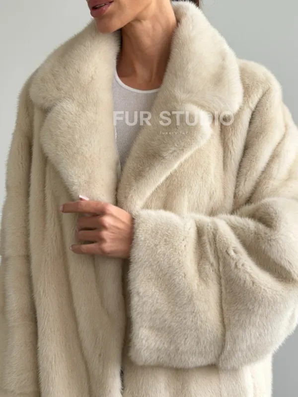Мех данной шубы аукционная норка, цвет белый. Предлагается в размерах от 42 до 56. Длина модели 65-70 см, что выгодно подчеркивает фигуру девушек. Эта модель идеально подойдет для девушек и женщин, предпочитающих роскошные натуральные меха.