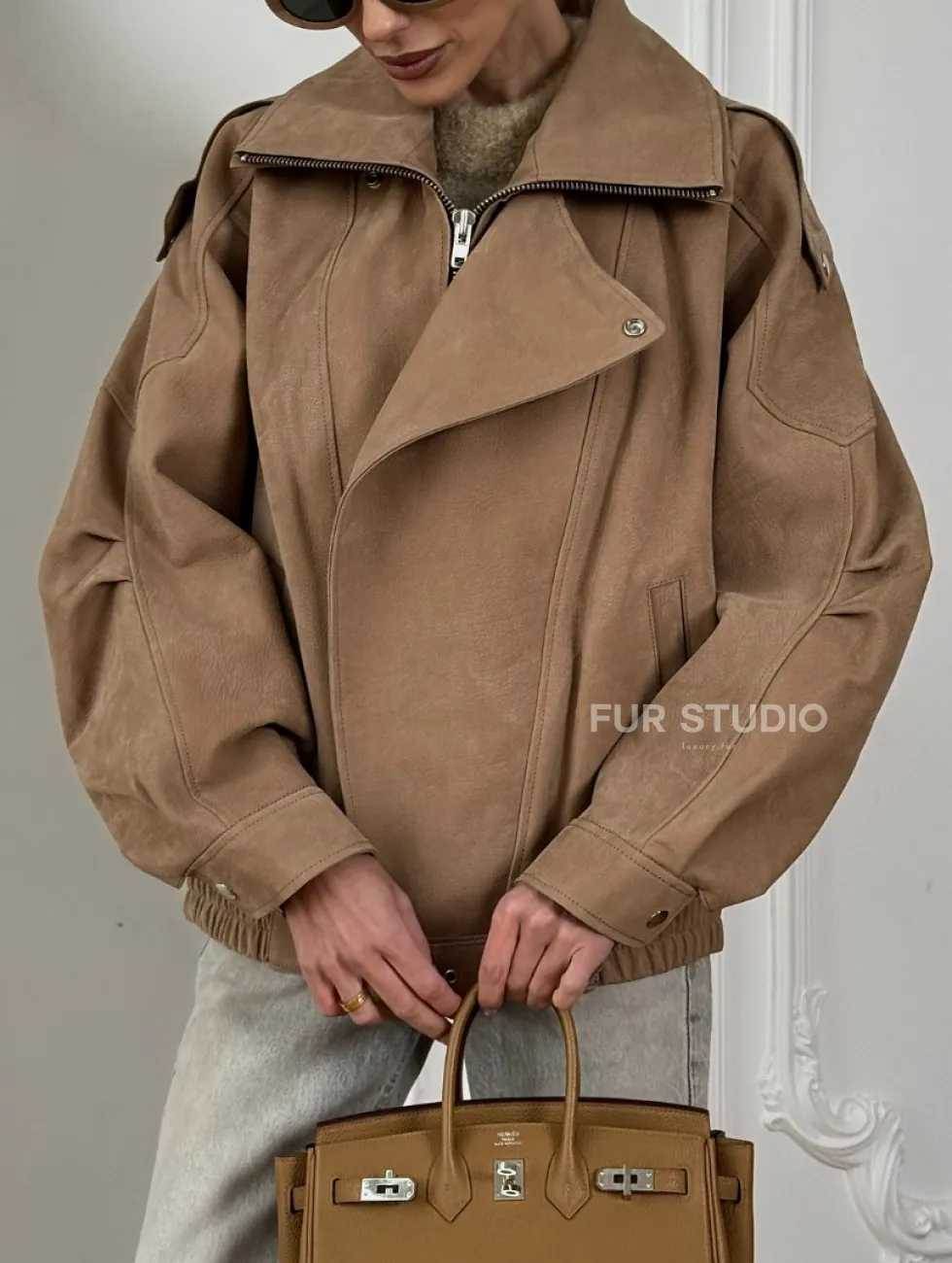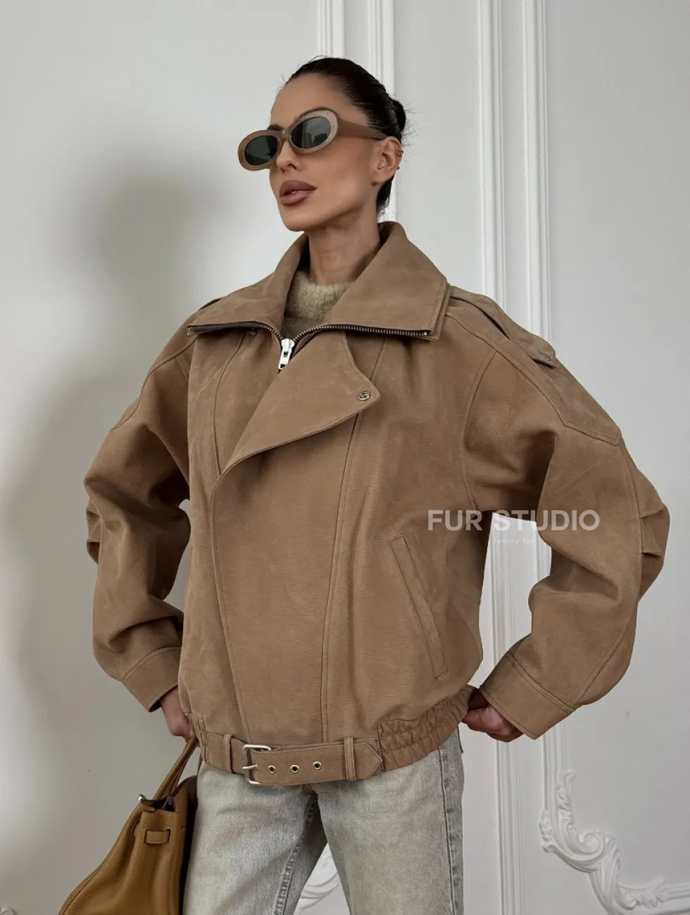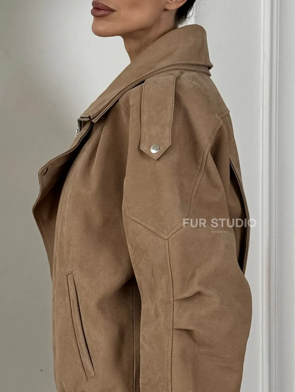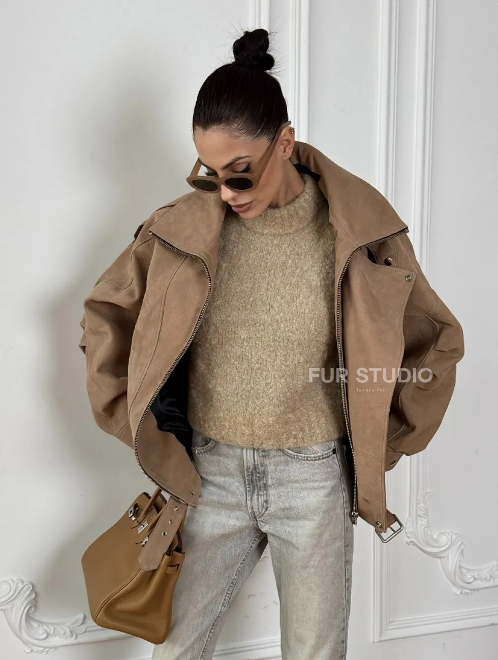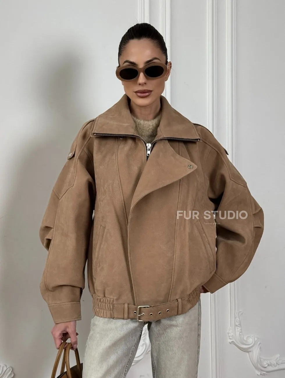 Восхититесь элегантностью и несравненным комфортом с нашей эксклюзивной коллекцией кожаных изделий. Изготовленная из первоклассной натуральной кожи, Женский замшевый бомбер из натуральной кожи «Creamy» с двойным воротником - оверсайз не только согреет вас в прохладные дни, но и подчеркнет ваш изысканный вкус. Уникальный дизайн и высокое качество делают наши представленные образцы идеальным выбором для утончённых образов.