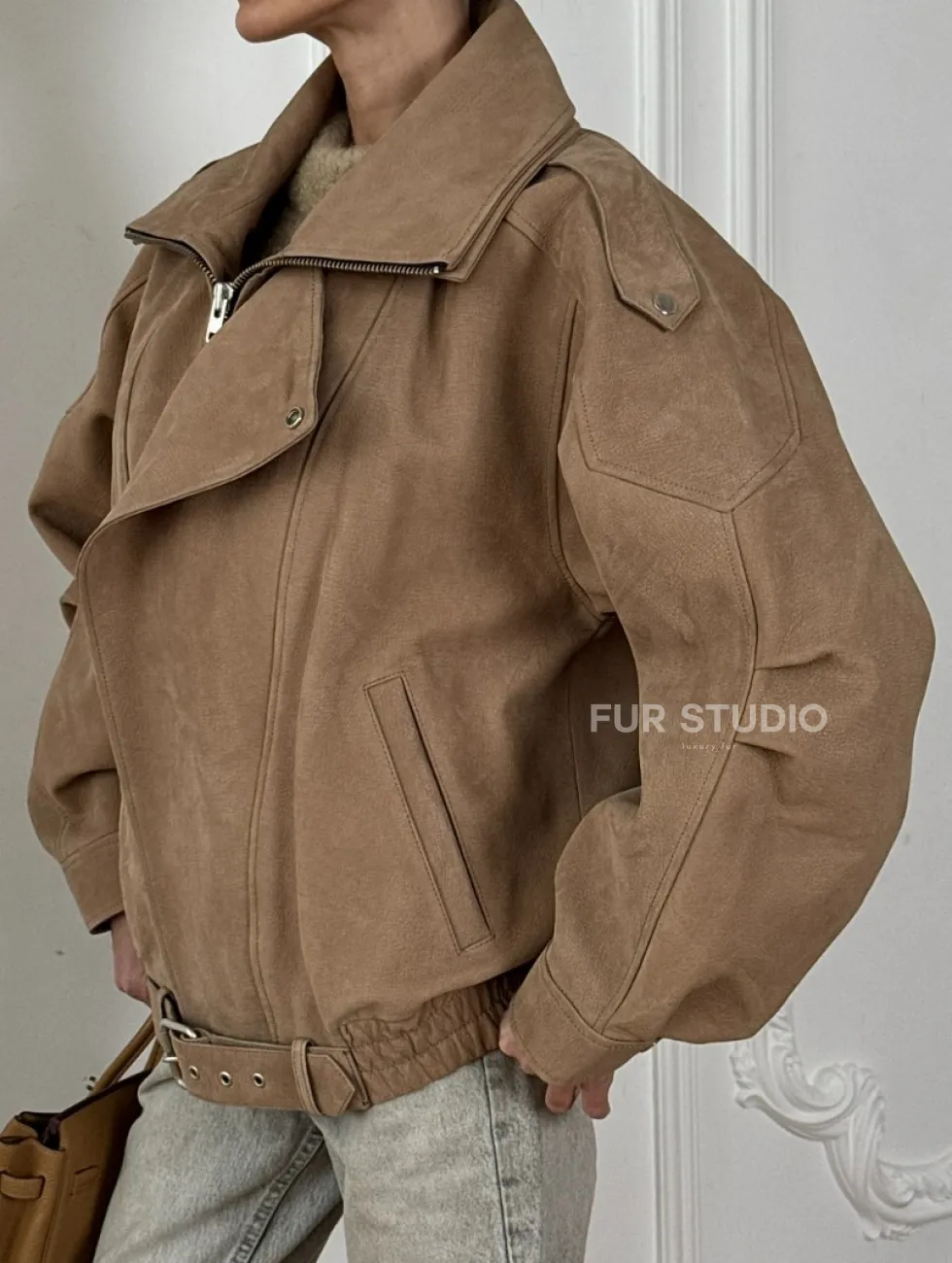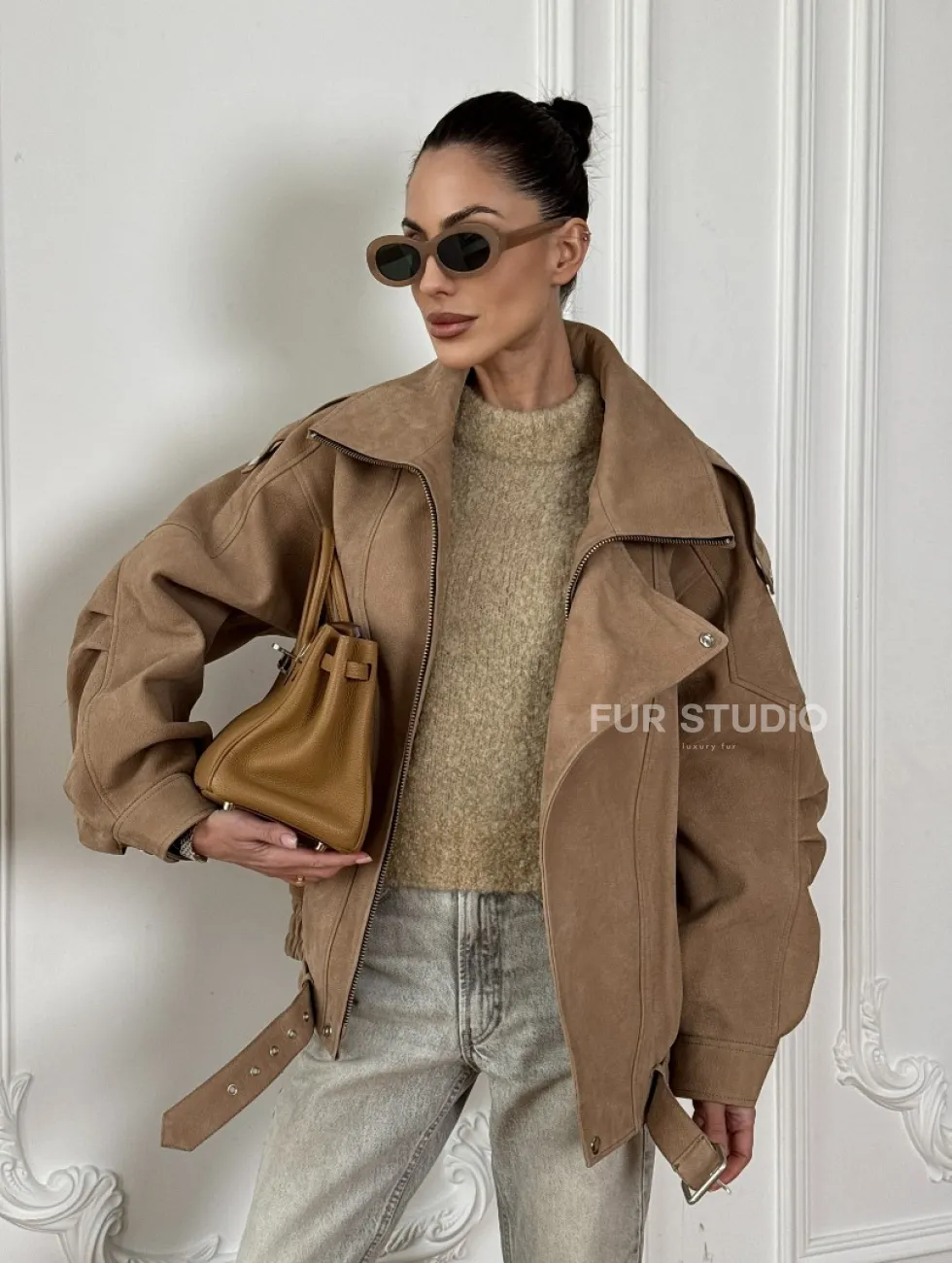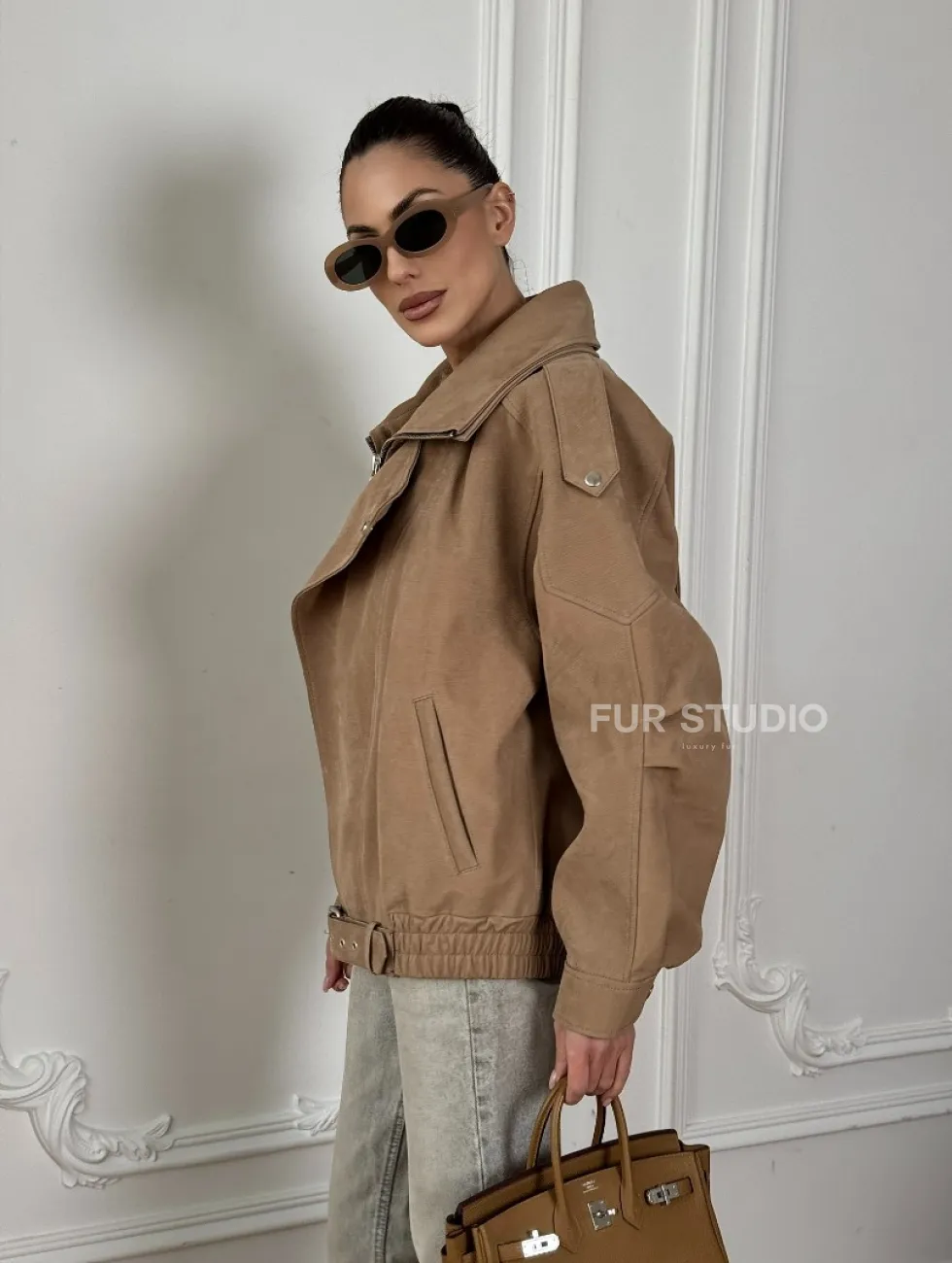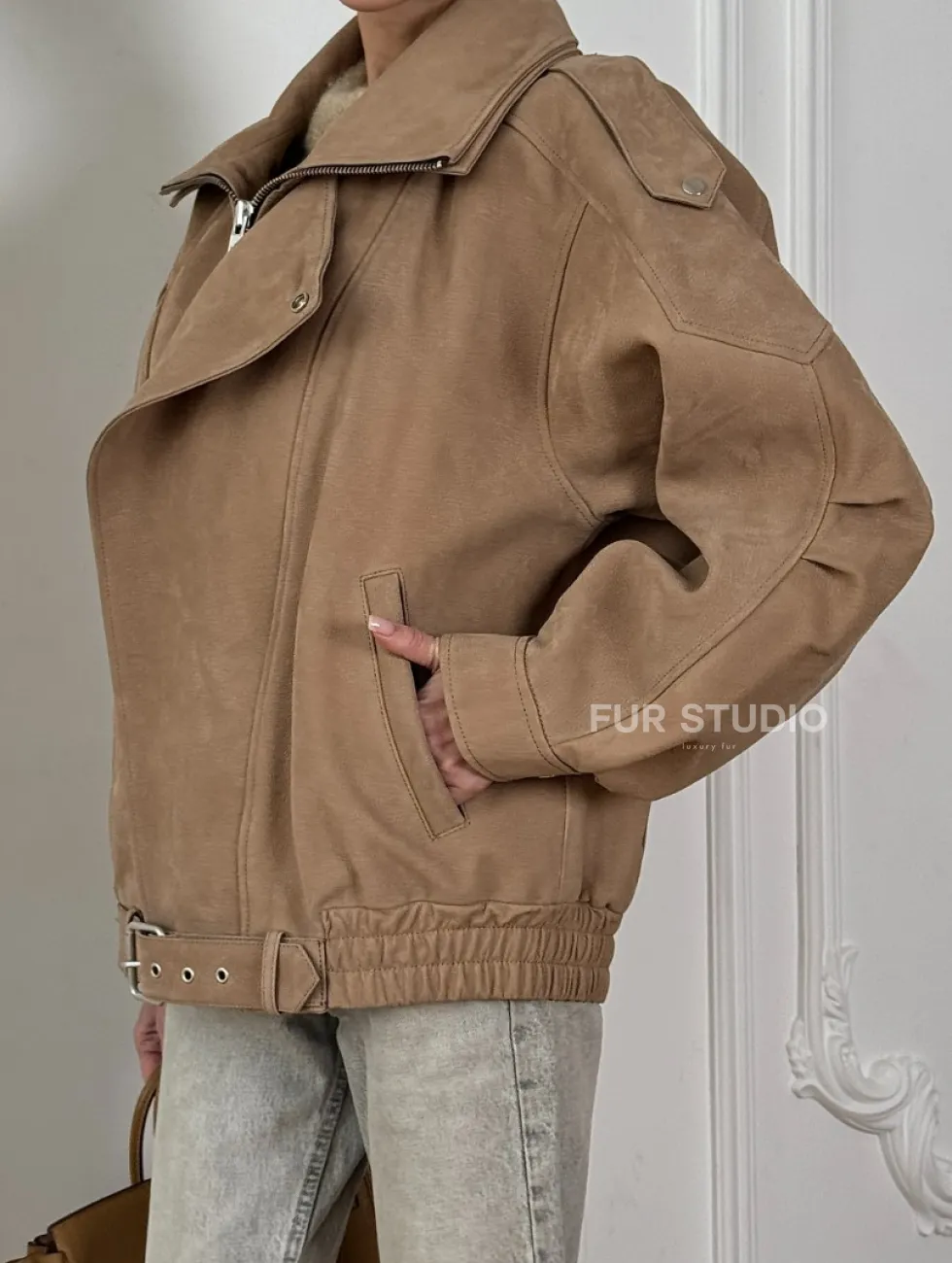 Женский замшевый бомбер из натуральной кожи «Creamy» с двойным воротником - оверсайз доступна для покупки в нашем шоуруме Furs Studio в Чите, где также предоставляется удобная доставка во все города России.