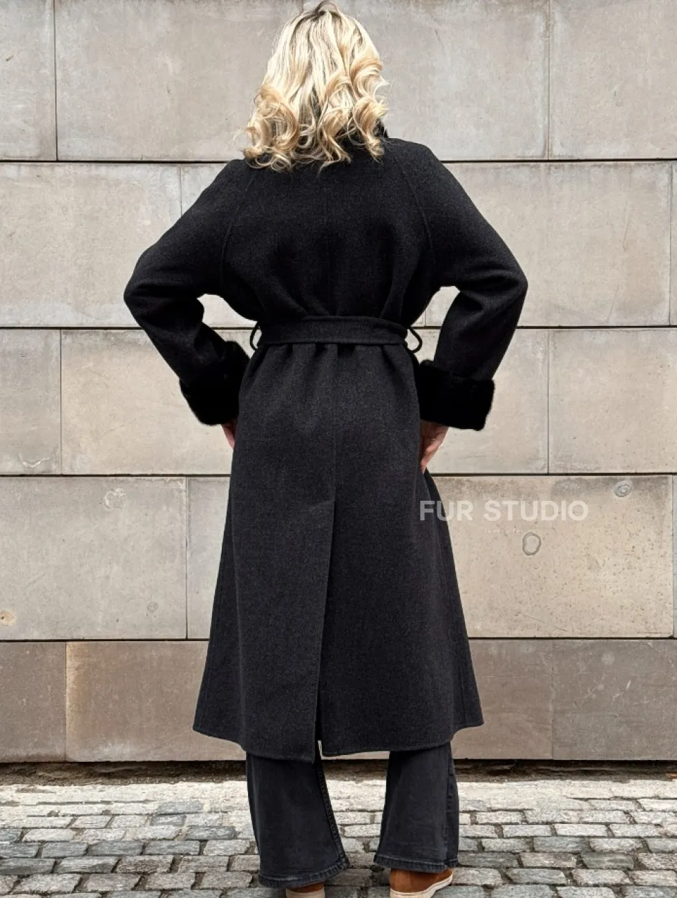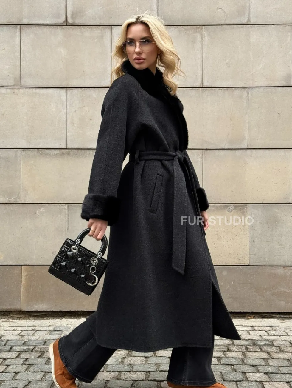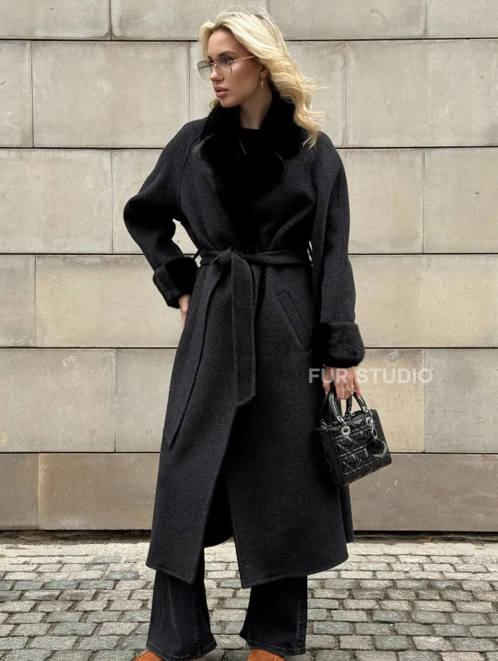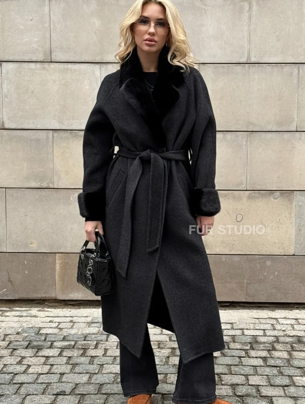 Женское демисезонное шерстяное пальто-халат с отделкой из меха норки 101808