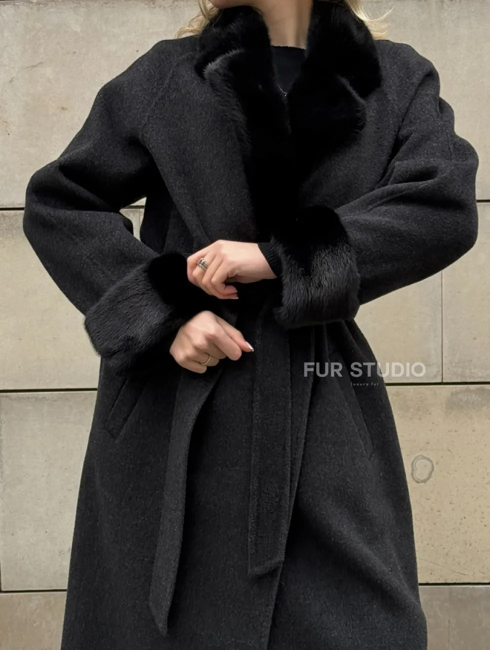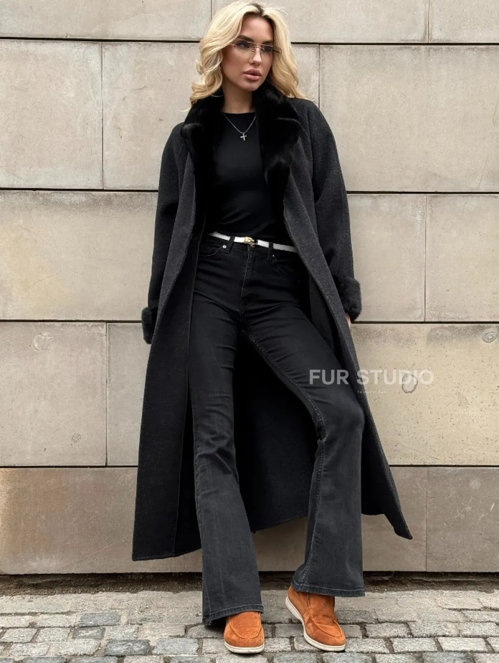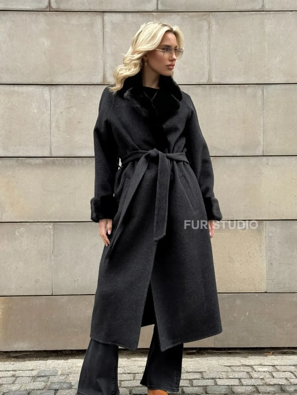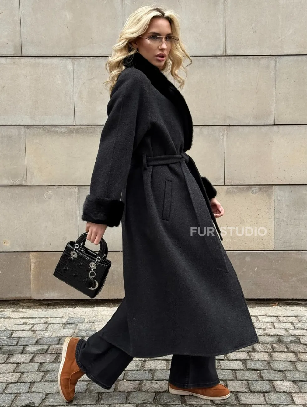 Женское демисезонное шерстяное пальто-халат с отделкой из меха норки 101808