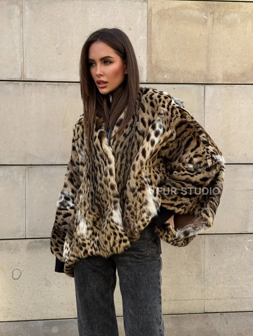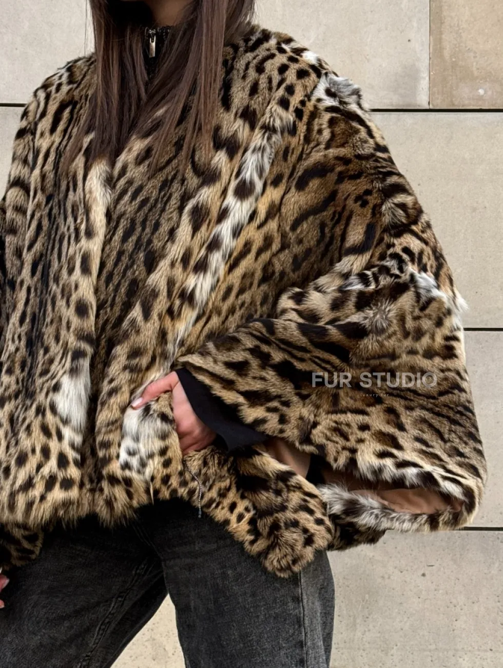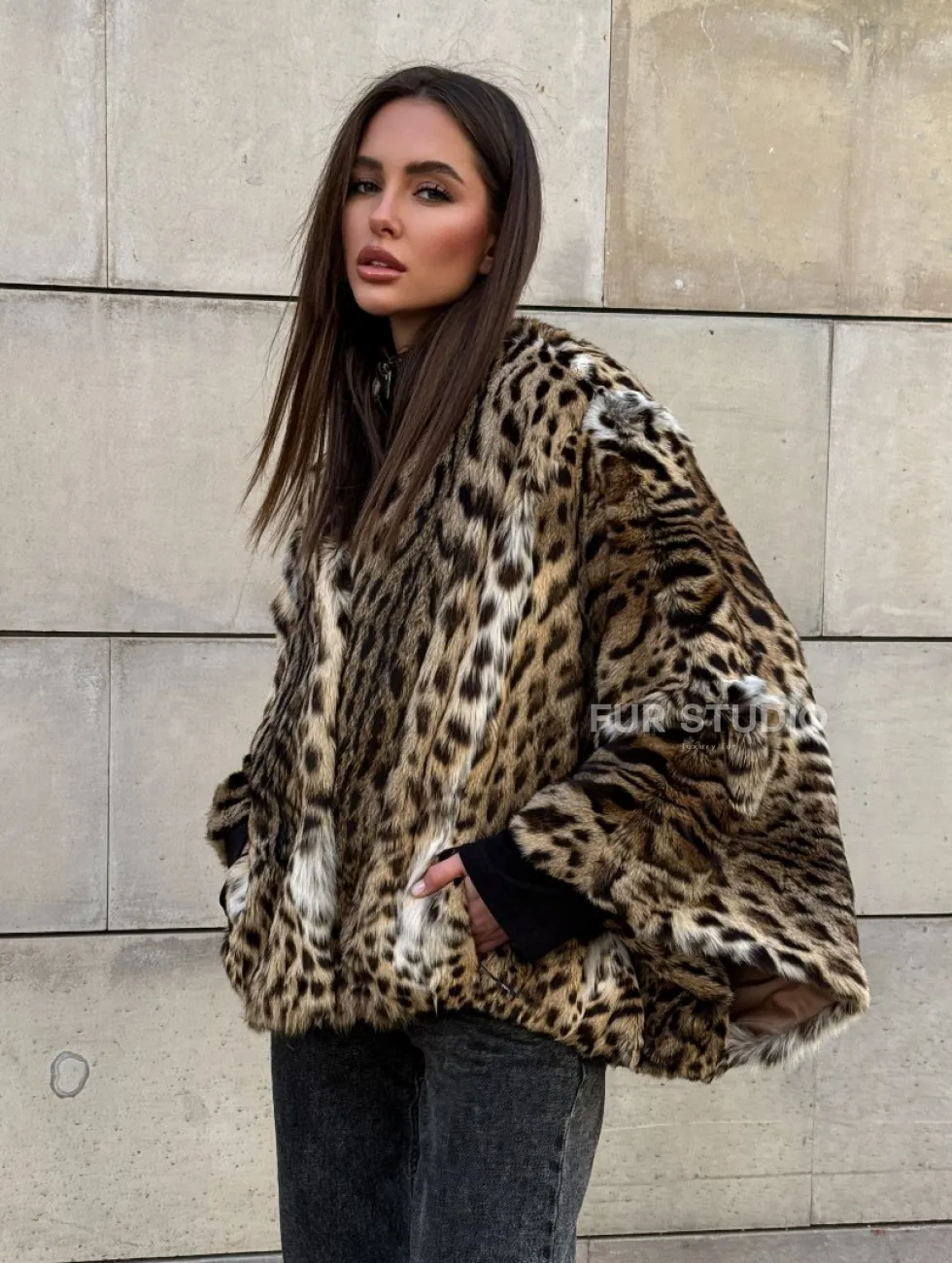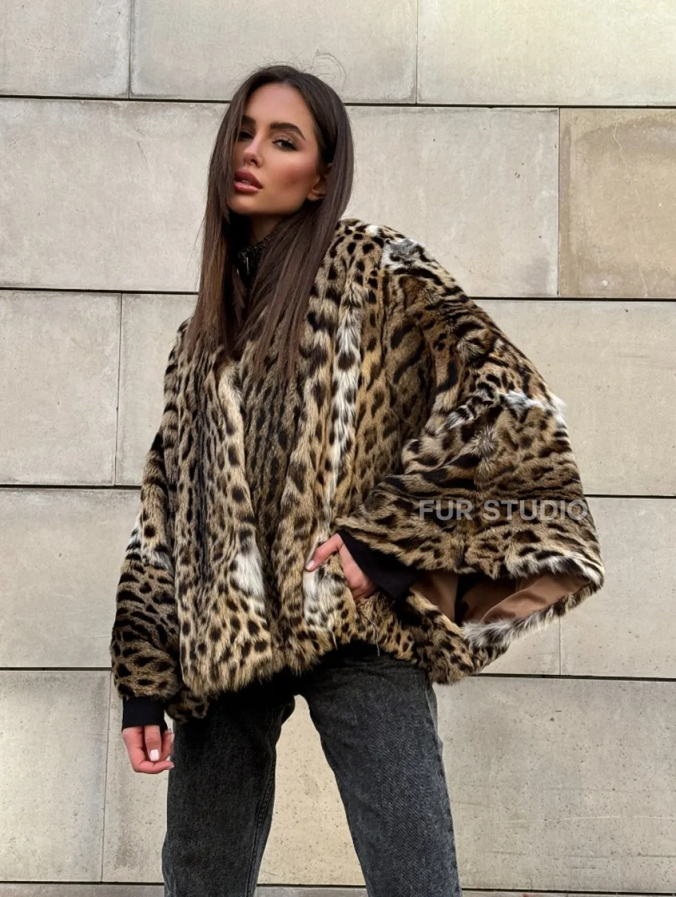 Мех данной шубы оцелот, цвет леопард. Предлагается в размерах от 42 до 54 (oversize). Длина модели 50-55 см, что выгодно подчеркивает фигуру девушек. Эта модель идеально подойдет для девушек и женщин, предпочитающих роскошные натуральные меха.