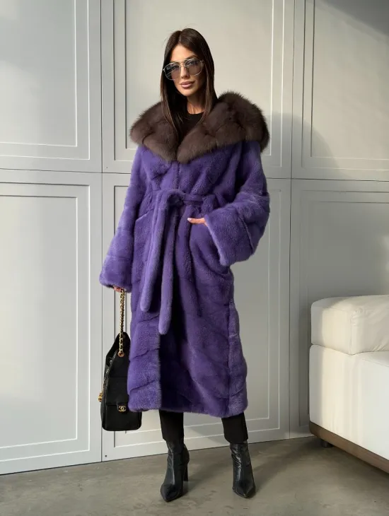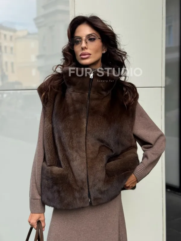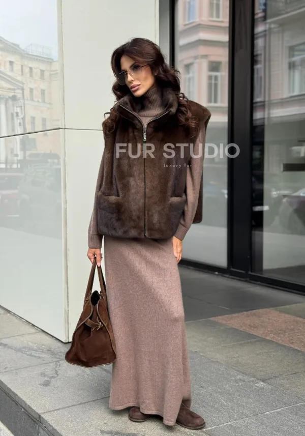 Мех данного жилета - аукционная норка, цвет коричневый. Идеальная длина модели 60-65 см лестно подчеркнет вашу фигуру. Эта модель станет неотъемлемой частью гардероба для женщин, предпочитающих непревзойденный стиль и роскошь натуральных материалов.