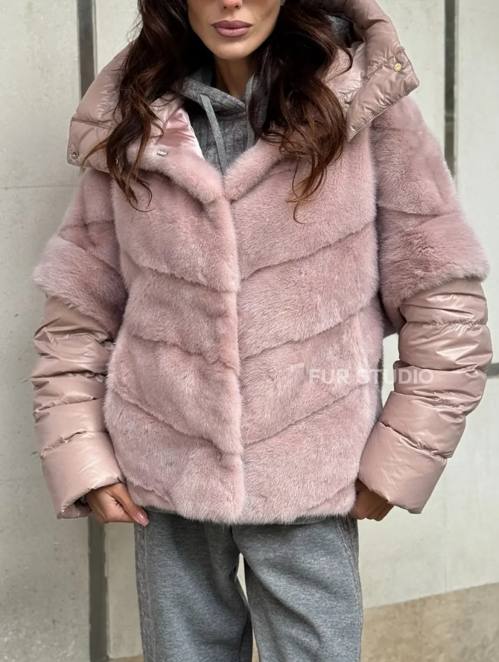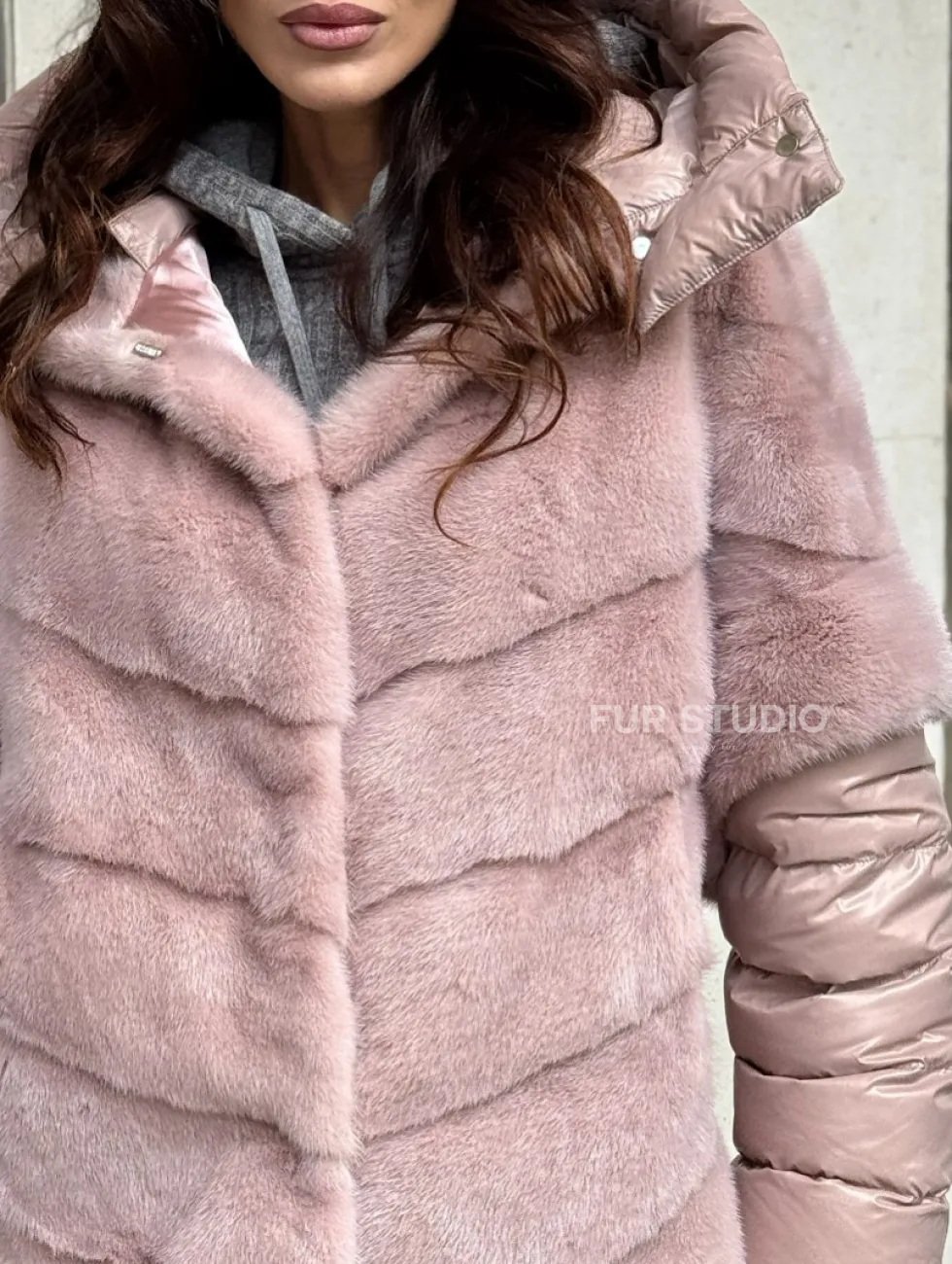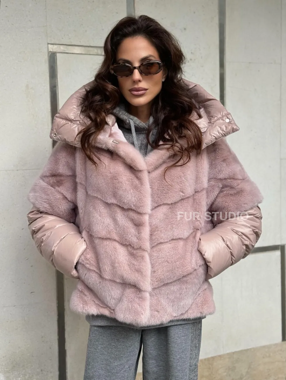 Материал выбранной модели — аукционная норка, доступна в цвете розовый. Куртка предлагается в разнообразии размеров, от S до XL, а ее длина составляет 55-60 см, что выигрышно подчеркивает вашу фигуру. Этот вариант идеально подходит для тех, кто ценит роскошь и утонченность натуральных материалов.