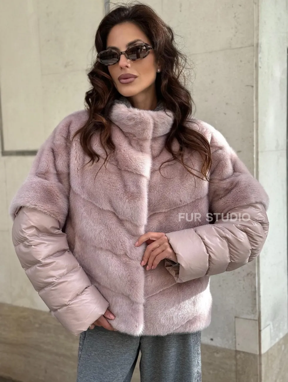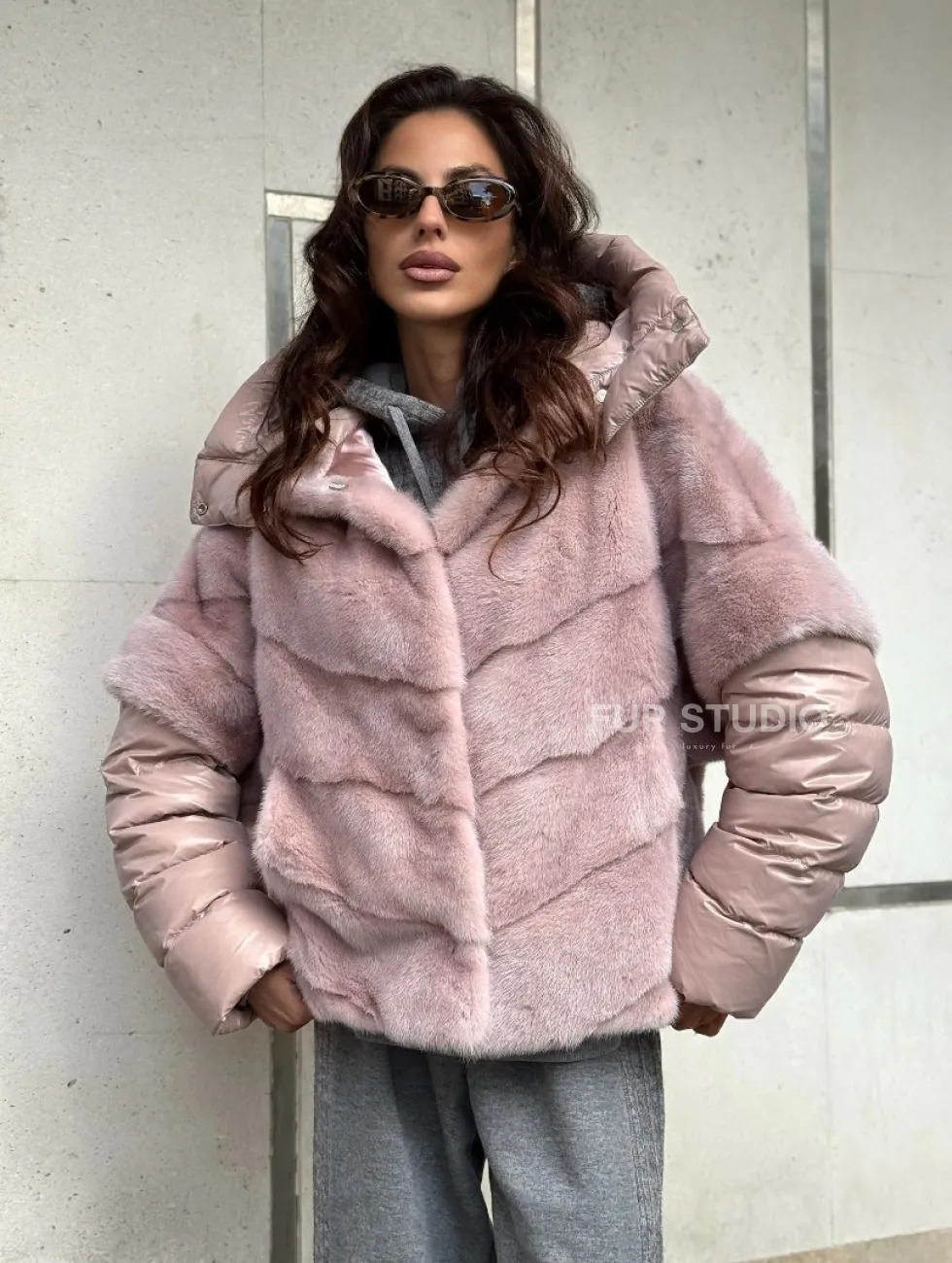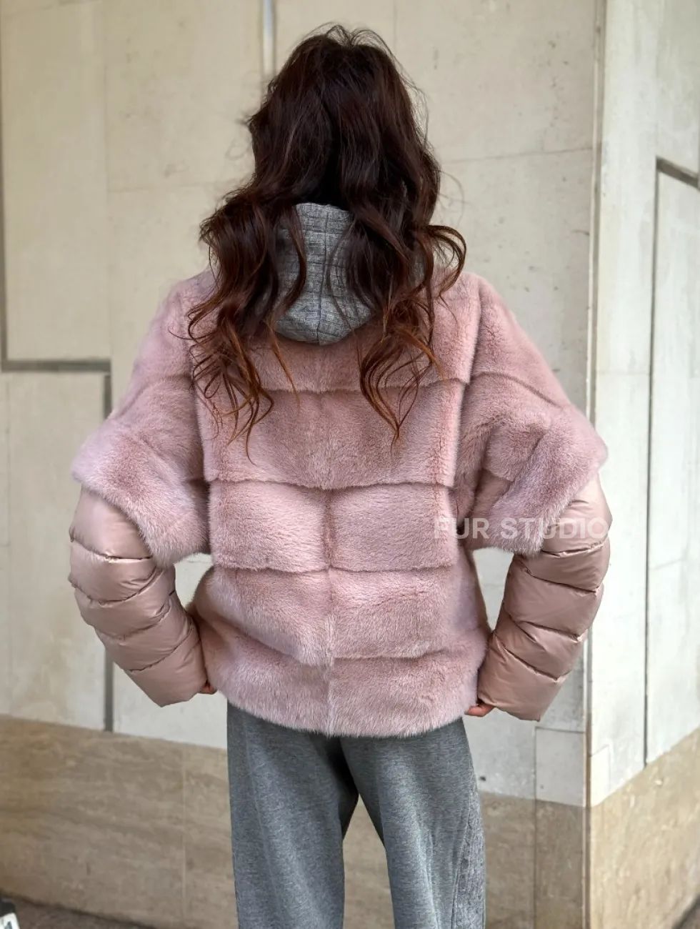 Материал выбранной модели — аукционная норка, доступна в цвете розовый. Куртка предлагается в разнообразии размеров, от S до XL, а ее длина составляет 55-60 см, что выигрышно подчеркивает вашу фигуру. Этот вариант идеально подходит для тех, кто ценит роскошь и утонченность натуральных материалов.
